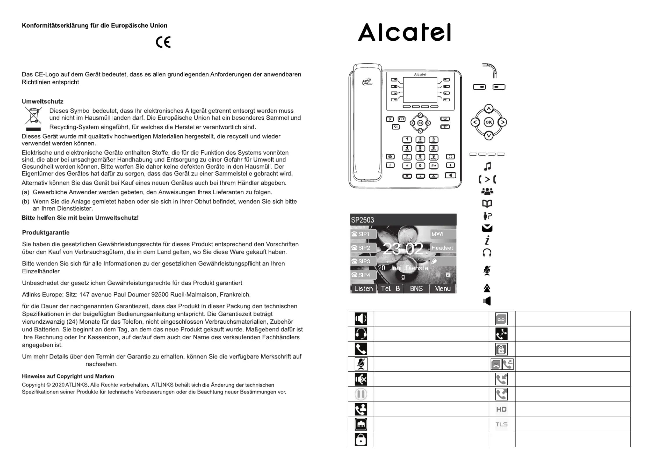 ATLINKS erklärt, dass die Alcatel SP2503 / SP2503G Telefone den maßgeblichen Anforderungen und