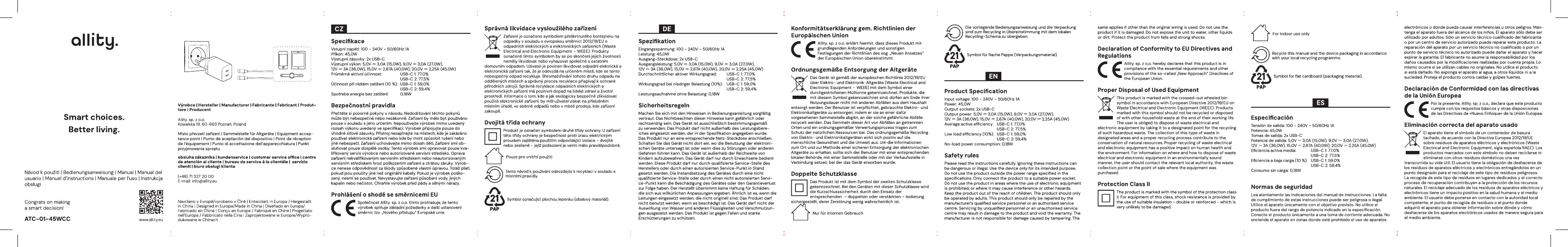 Lies die bedienungsanleitung für allity ATC-01-45WCC (2 Seiten) kostenlos online; sie gehört zur Kategorie Handyladegerät. Dieses Handbuch wurde von 9 Personen als hilfreich bewertet und erhielt im Schnitt 5.0 Sterne aus 5 Bewertungen. Hast du eine Frage zu allity ATC-01-45WCC oder möchtest du andere Nutzer dieses Produkts befragen? Stelle eine Frage