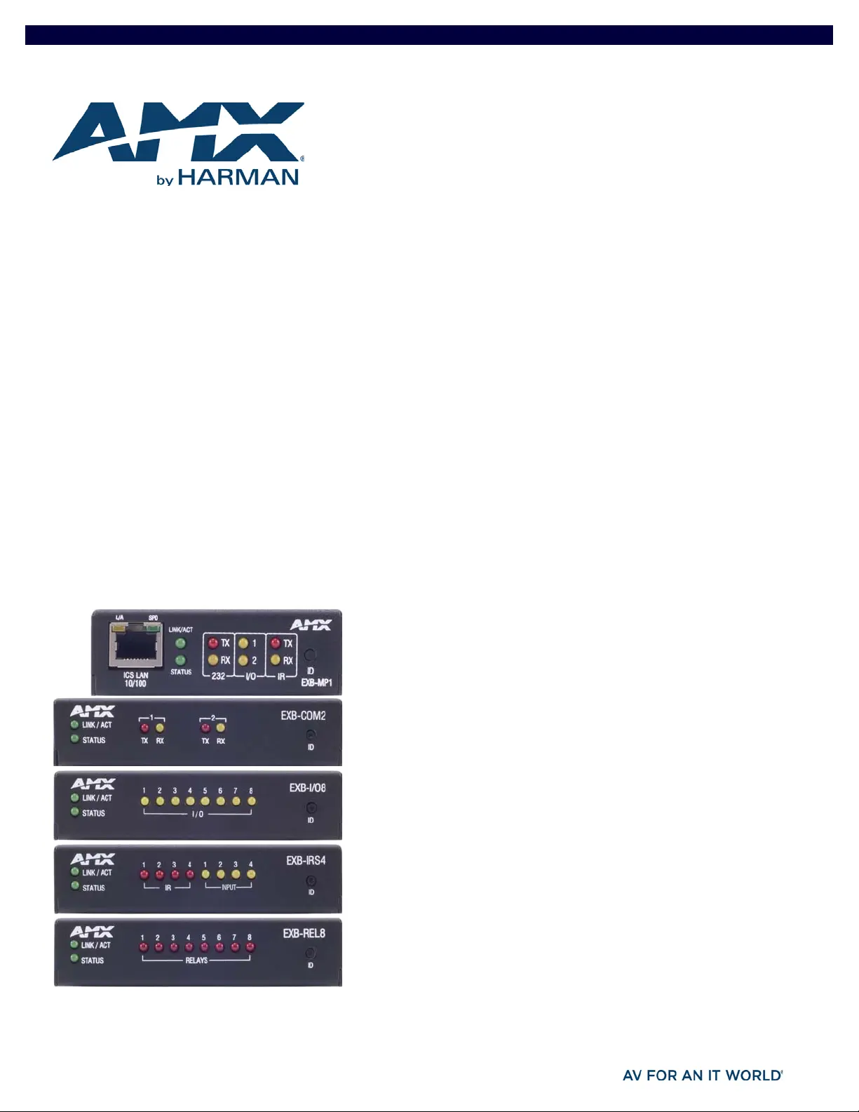 Lies die bedienungsanleitung für AMX EXB-COM2 (56 Seiten) kostenlos online; sie gehört zur Kategorie Nicht kategorisiert. Dieses Handbuch wurde von 30 Personen als hilfreich bewertet und erhielt im Schnitt 4.6 Sterne aus 6 Bewertungen. Hast du eine Frage zu AMX EXB-COM2 oder möchtest du andere Nutzer dieses Produkts befragen? Stelle eine Frage