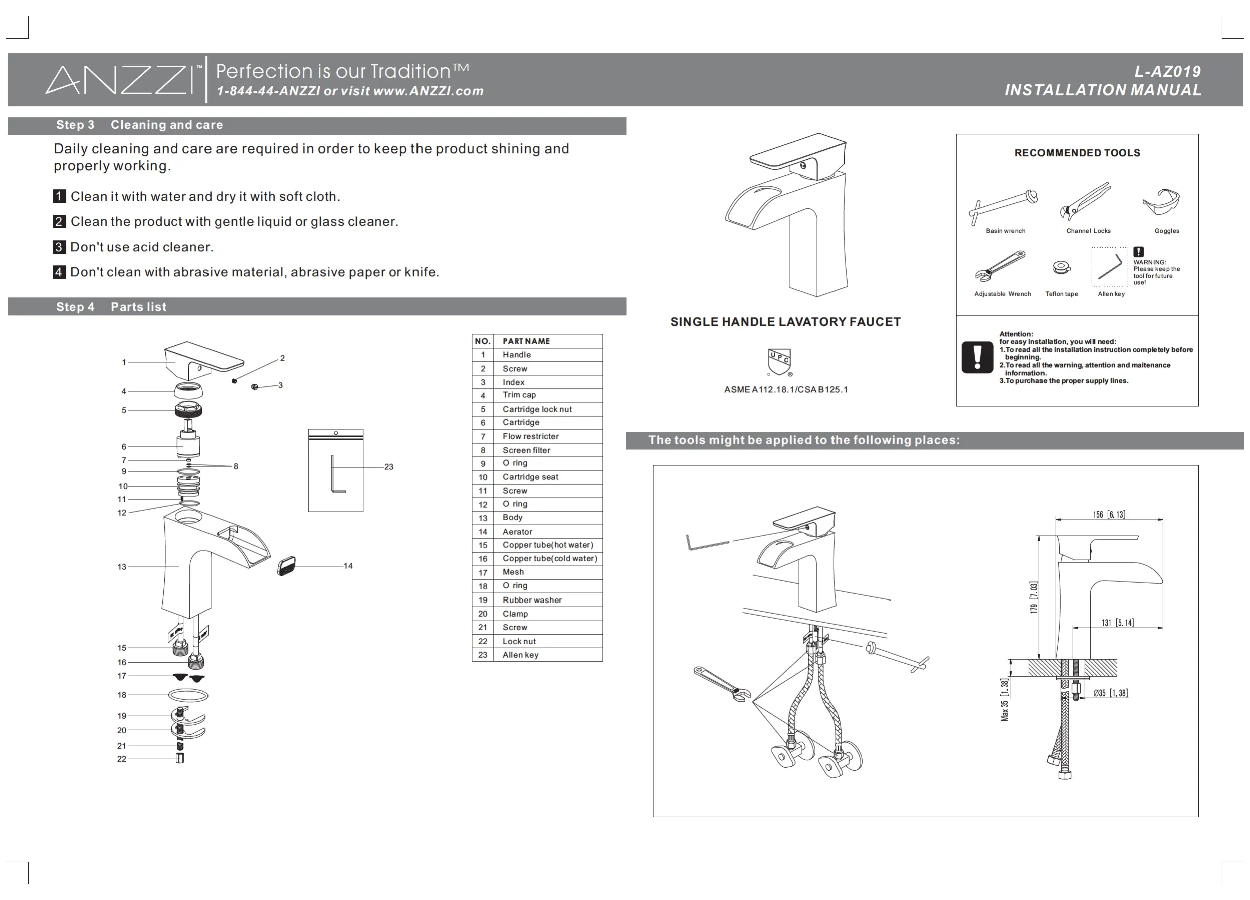 Lies die bedienungsanleitung für ANZZI L-AZ019 (2 Seiten) kostenlos online; sie gehört zur Kategorie Wasserhahn. Dieses Handbuch wurde von 2 Personen als hilfreich bewertet und erhielt im Schnitt 5.0 Sterne aus 2 Bewertungen. Hast du eine Frage zu ANZZI L-AZ019 oder möchtest du andere Nutzer dieses Produkts befragen? Stelle eine Frage