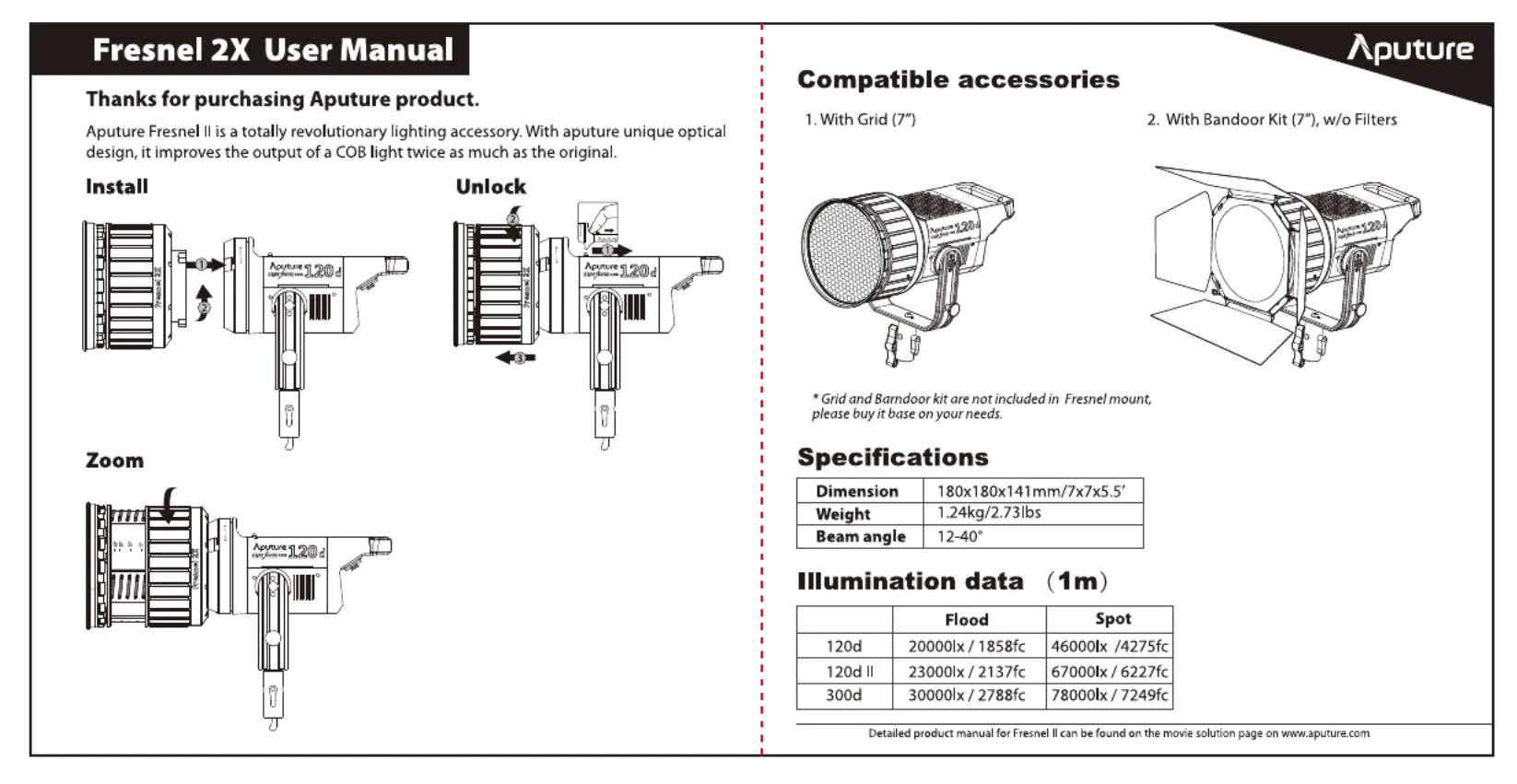 Lies die bedienungsanleitung für Aputure Fresnel 2X (1 Seiten) kostenlos online; sie gehört zur Kategorie Objektiv. Dieses Handbuch wurde von 12 Personen als hilfreich bewertet und erhielt im Schnitt 4.7 Sterne aus 6.5 Bewertungen. Hast du eine Frage zu Aputure Fresnel 2X oder möchtest du andere Nutzer dieses Produkts befragen? Stelle eine Frage