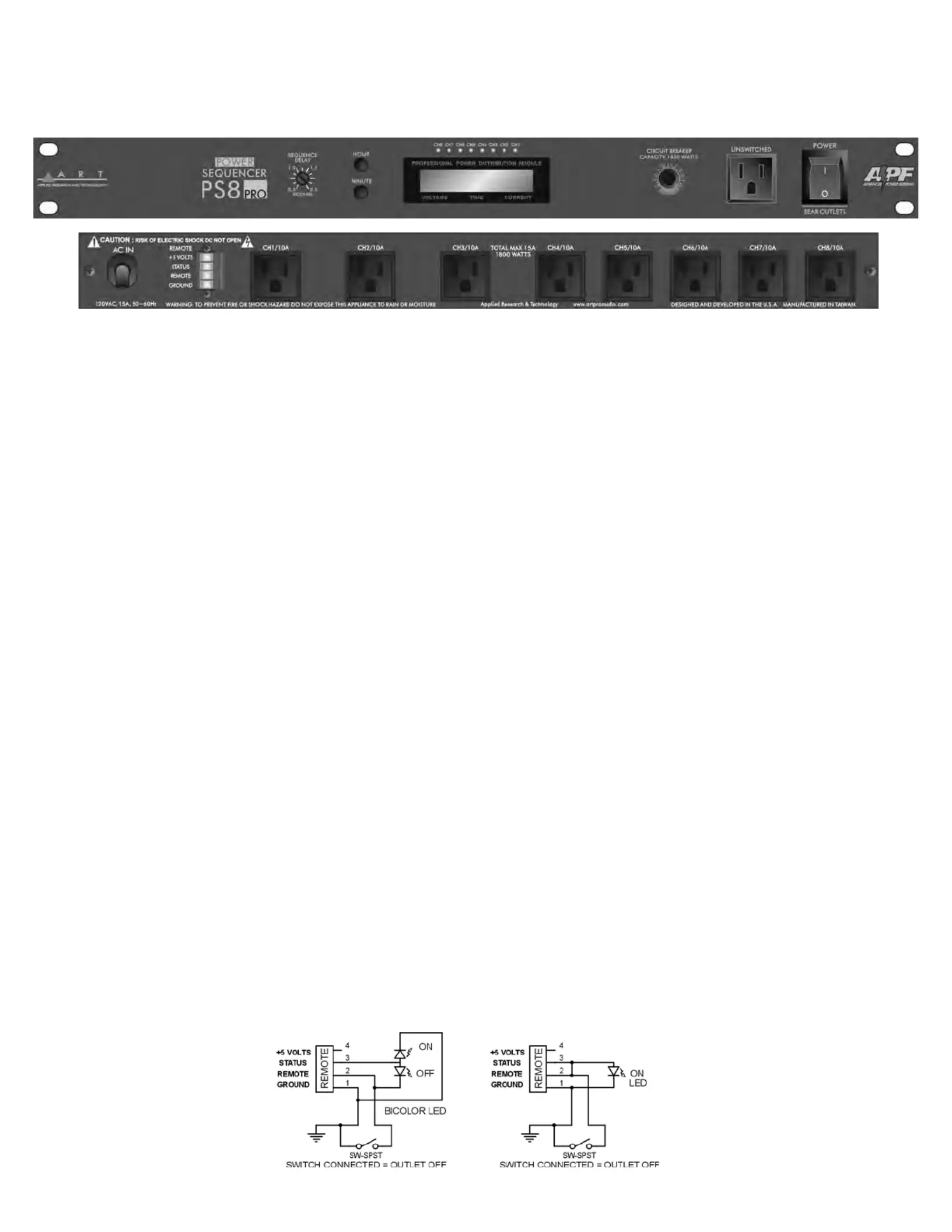 rovides controlled power sequencing to 8 rear AC outlets. Each output is delayed by a fixed amount that is determined by the front panel