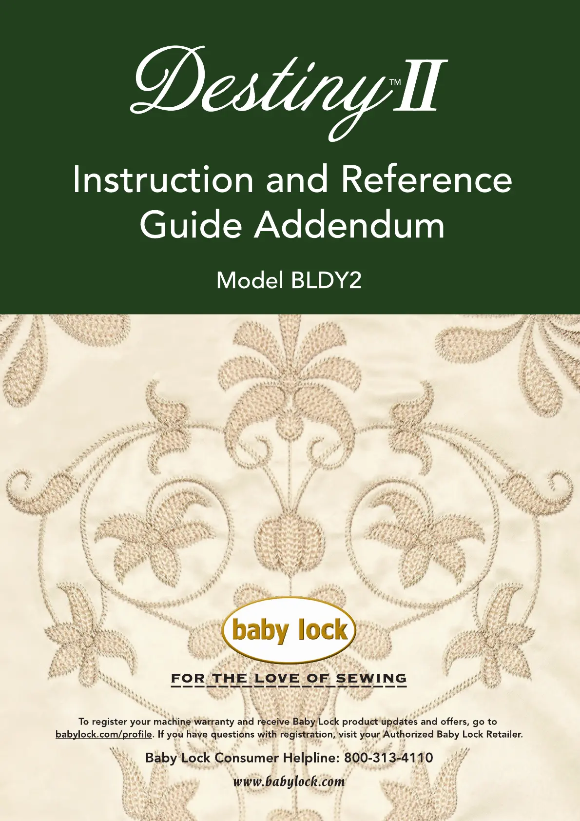 Lies die bedienungsanleitung für Baby Lock Destiny II BLDY2 (52 Seiten) kostenlos online; sie gehört zur Kategorie Nähmaschine. Dieses Handbuch wurde von 45 Personen als hilfreich bewertet und erhielt im Schnitt 4.4 Sterne aus 23 Bewertungen. Hast du eine Frage zu Baby Lock Destiny II BLDY2 oder möchtest du andere Nutzer dieses Produkts befragen? Stelle eine Frage