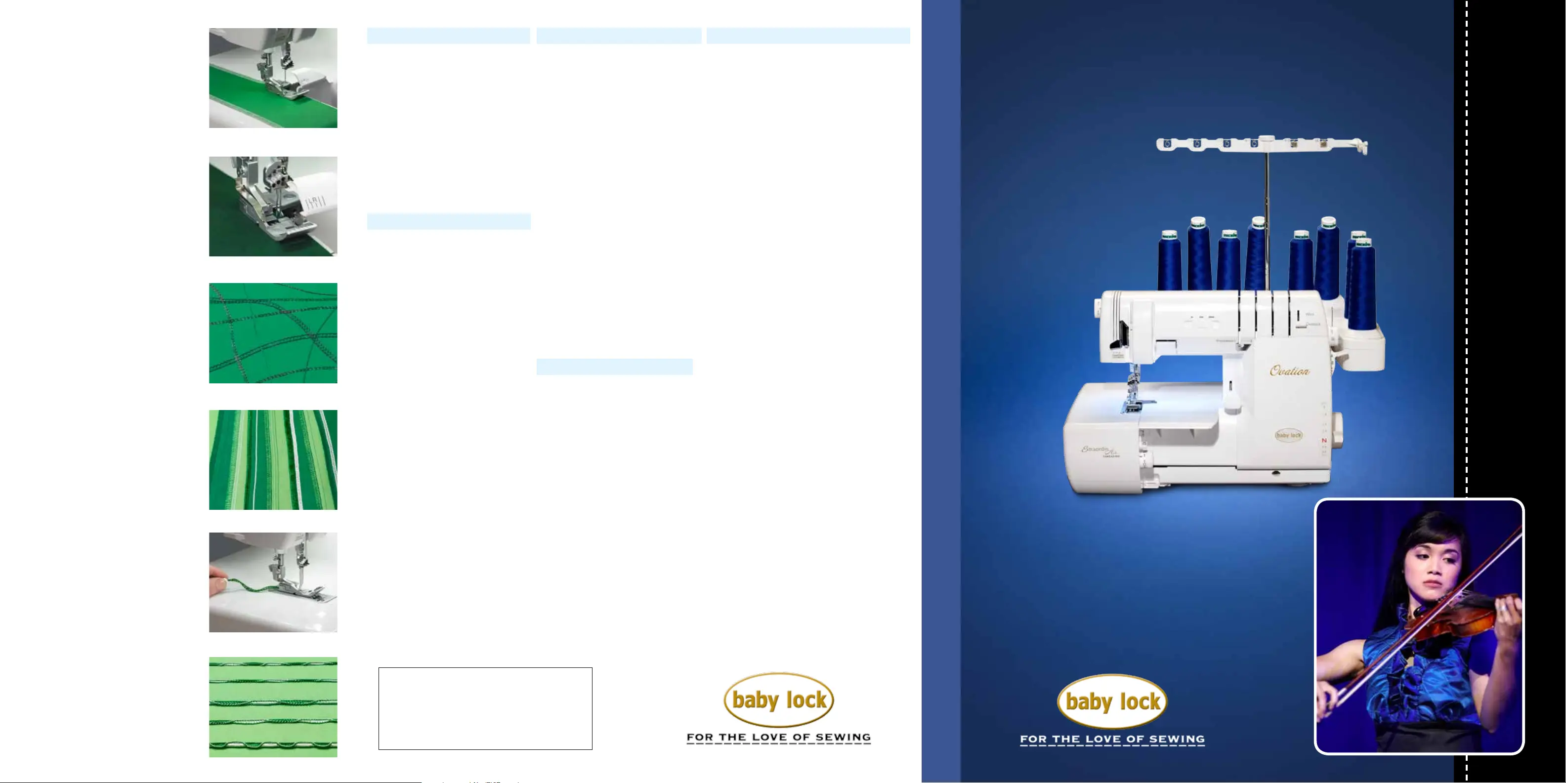 Lies die bedienungsanleitung für Baby Lock Ovation - BLES8 (2 Seiten) kostenlos online; sie gehört zur Kategorie Nähmaschine. Dieses Handbuch wurde von 22 Personen als hilfreich bewertet und erhielt im Schnitt 4.7 Sterne aus 11.5 Bewertungen. Hast du eine Frage zu Baby Lock Ovation - BLES8 oder möchtest du andere Nutzer dieses Produkts befragen? Stelle eine Frage