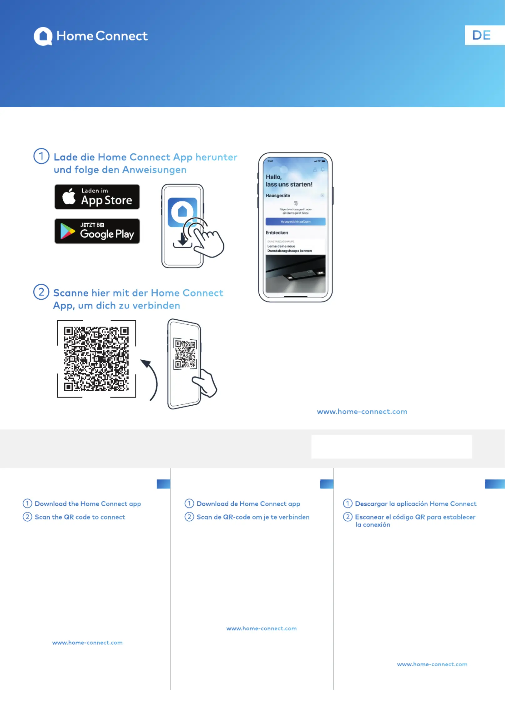 App Inhalte sind dynamisch und abhängig vom verbundenen Gerät und deinem Land. Die Verügbarkeit der Home Connect Funktion ist abhängig von den