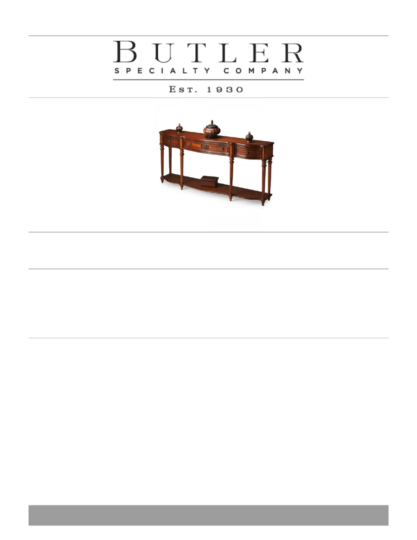 Lies die bedienungsanleitung für Butler Peyton 3028001 (1 Seiten) kostenlos online; sie gehört zur Kategorie Tisch . Dieses Handbuch wurde von 33 Personen als hilfreich bewertet und erhielt im Schnitt 4.4 Sterne aus 6 Bewertungen. Hast du eine Frage zu Butler Peyton 3028001 oder möchtest du andere Nutzer dieses Produkts befragen? Stelle eine Frage