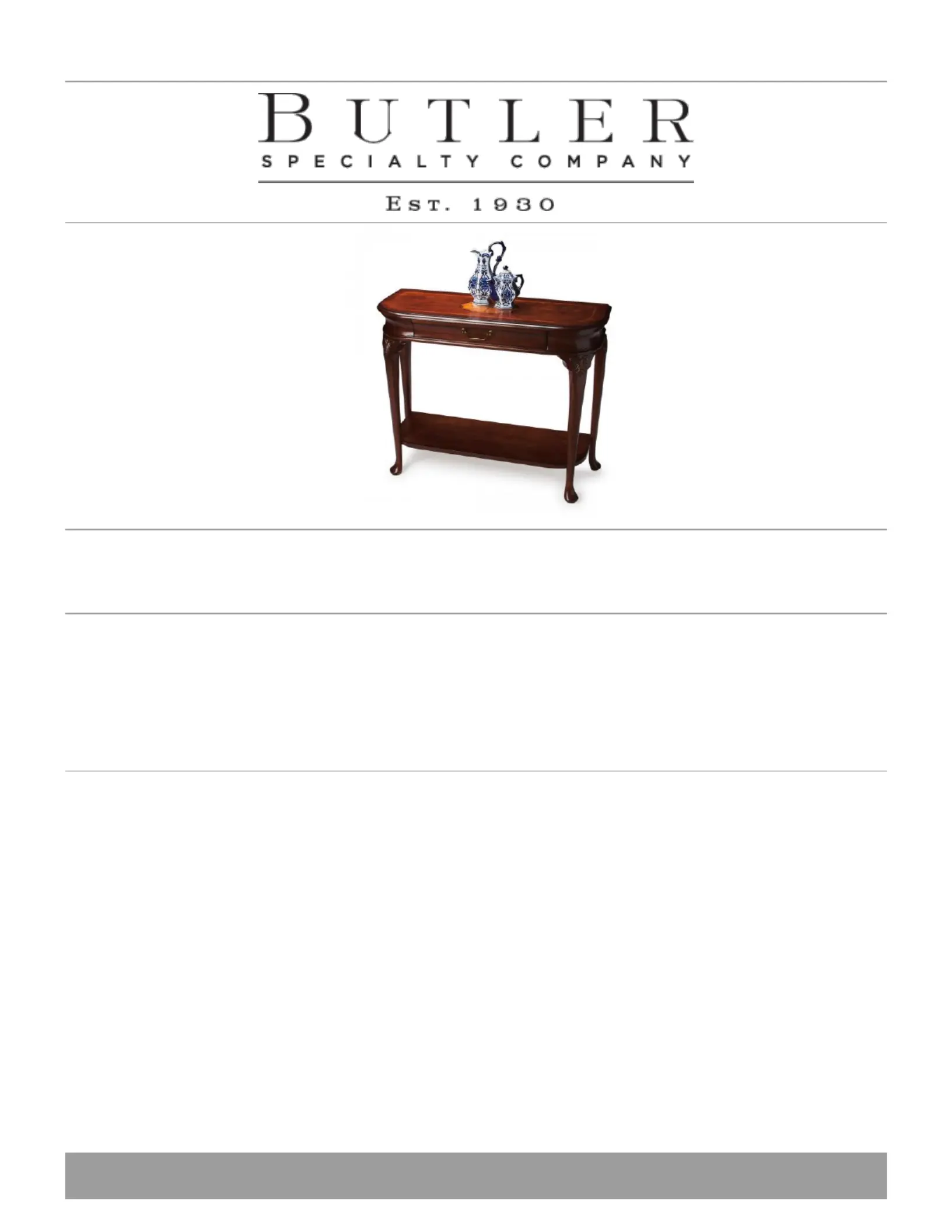 Lies die bedienungsanleitung für Butler Ridgeland 2110024 (1 Seiten) kostenlos online; sie gehört zur Kategorie Tisch . Dieses Handbuch wurde von 26 Personen als hilfreich bewertet und erhielt im Schnitt 4.6 Sterne aus 13.5 Bewertungen. Hast du eine Frage zu Butler Ridgeland 2110024 oder möchtest du andere Nutzer dieses Produkts befragen? Stelle eine Frage