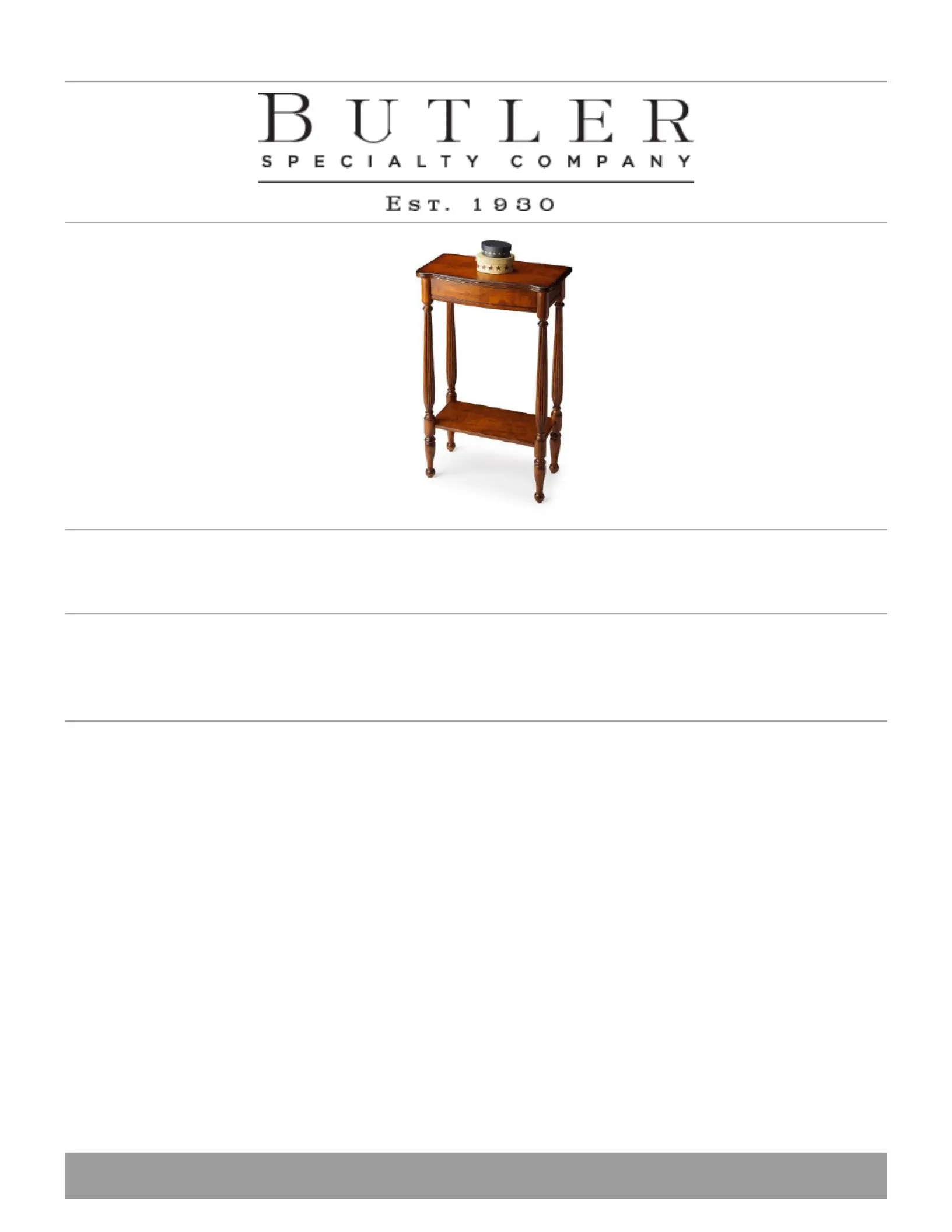 Lies die bedienungsanleitung für Butler Whitney 3011011 (1 Seiten) kostenlos online; sie gehört zur Kategorie Tisch . Dieses Handbuch wurde von 55 Personen als hilfreich bewertet und erhielt im Schnitt 4.7 Sterne aus 2 Bewertungen. Hast du eine Frage zu Butler Whitney 3011011 oder möchtest du andere Nutzer dieses Produkts befragen? Stelle eine Frage