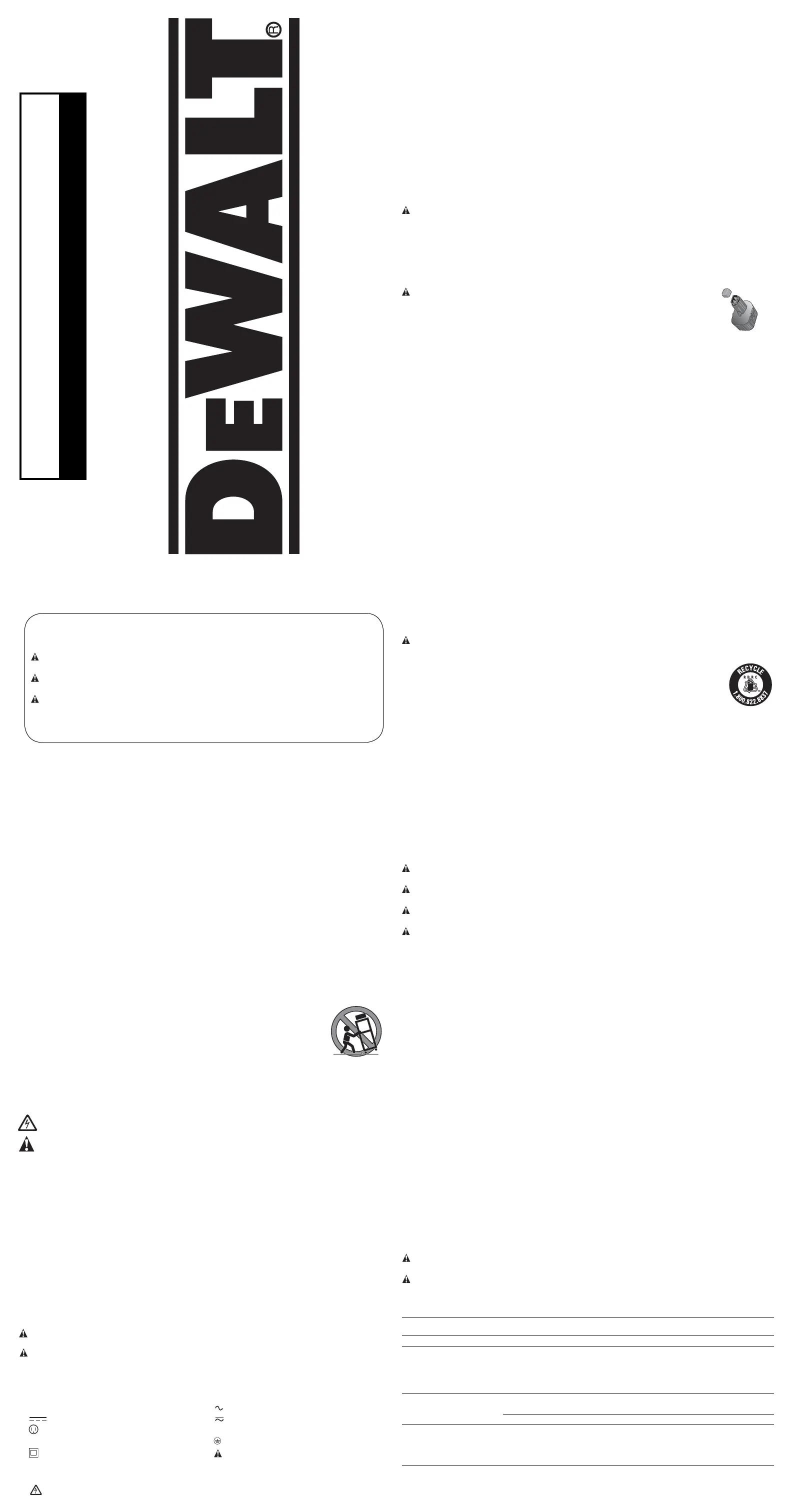 Lies die bedienungsanleitung für DeWalt DC012 (7 Seiten) kostenlos online; sie gehört zur Kategorie Radio. Dieses Handbuch wurde von 3 Personen als hilfreich bewertet und erhielt im Schnitt 5.0 Sterne aus 9 Bewertungen. Hast du eine Frage zu DeWalt DC012 oder möchtest du andere Nutzer dieses Produkts befragen? Stelle eine Frage