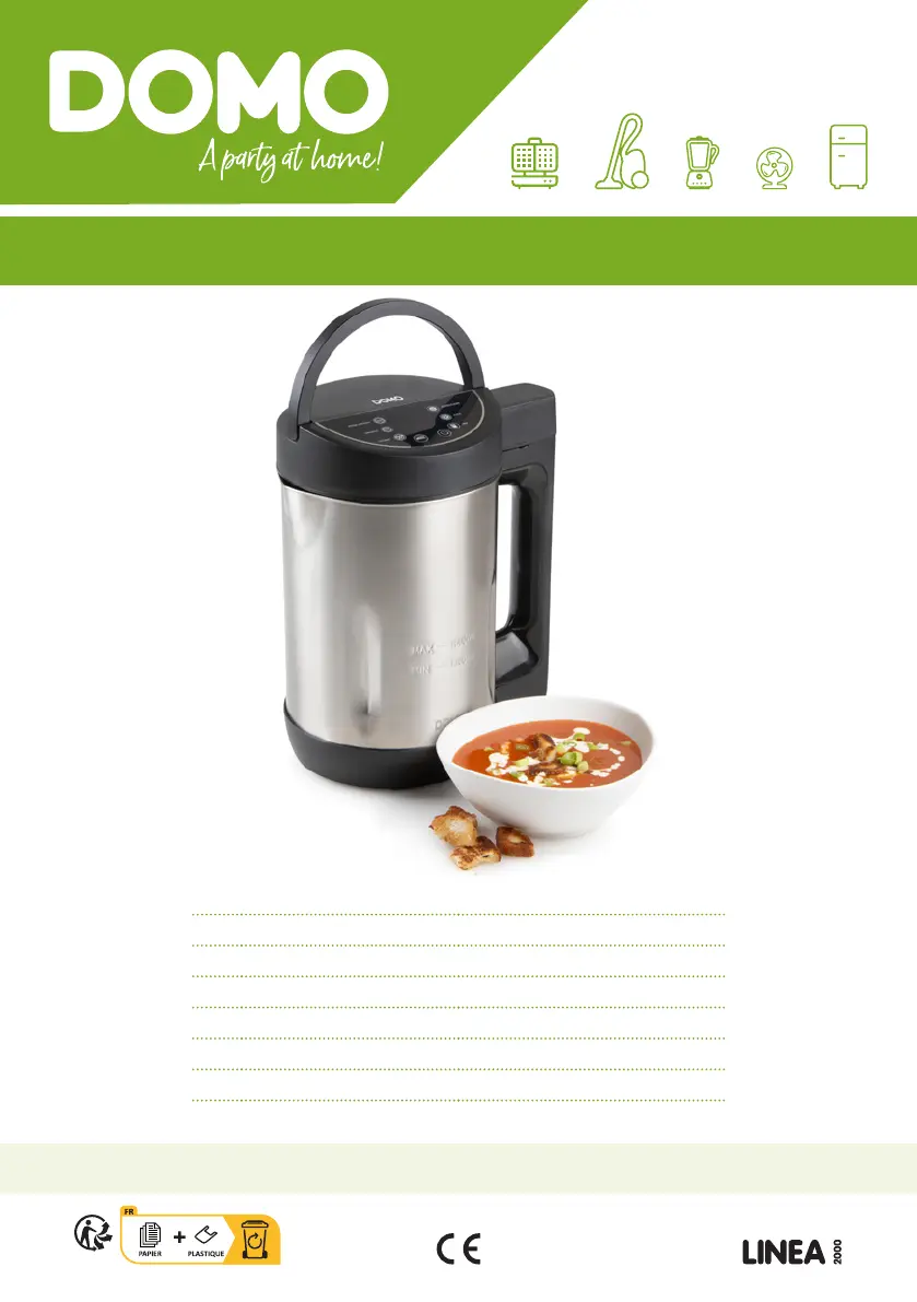 Lies die bedienungsanleitung für Domo DO1144BL (84 Seiten) kostenlos online; sie gehört zur Kategorie Suppenmacher. Dieses Handbuch wurde von 2 Personen als hilfreich bewertet und erhielt im Schnitt 4.4 Sterne aus 8 Bewertungen. Hast du eine Frage zu Domo DO1144BL oder möchtest du andere Nutzer dieses Produkts befragen? Stelle eine Frage