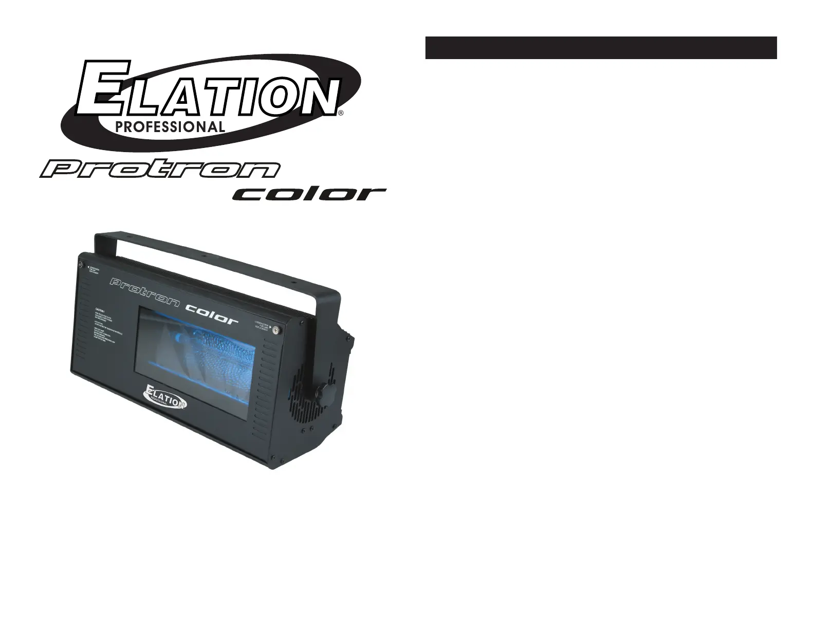 Lies die bedienungsanleitung für Elation Protron Color (8 Seiten) kostenlos online; sie gehört zur Kategorie Beleuchtung. Dieses Handbuch wurde von 7 Personen als hilfreich bewertet und erhielt im Schnitt 4.6 Sterne aus 4 Bewertungen. Hast du eine Frage zu Elation Protron Color oder möchtest du andere Nutzer dieses Produkts befragen? Stelle eine Frage