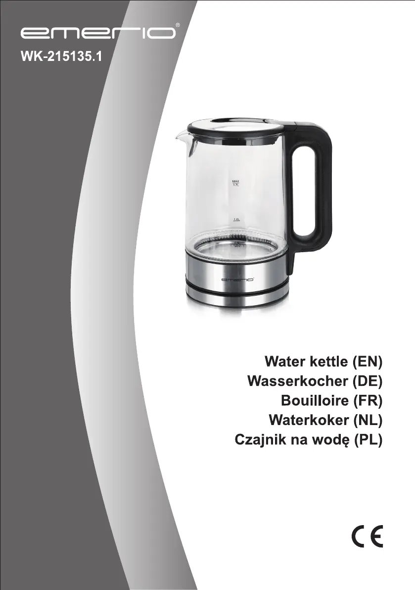 Lies die bedienungsanleitung für Emerio WK-215135.1 (32 Seiten) kostenlos online; sie gehört zur Kategorie Wasserkocher. Dieses Handbuch wurde von 26 Personen als hilfreich bewertet und erhielt im Schnitt 4.6 Sterne aus 13.5 Bewertungen. Hast du eine Frage zu Emerio WK-215135.1 oder möchtest du andere Nutzer dieses Produkts befragen? Stelle eine Frage