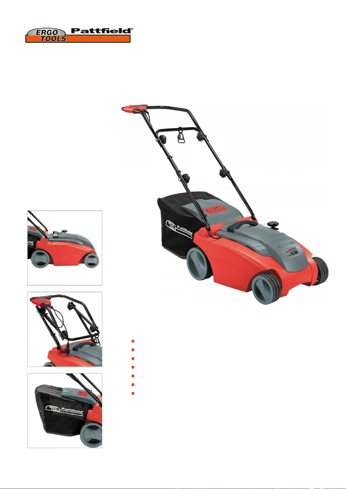 Lies die bedienungsanleitung für Ergotools Pattfield E-EM 1538 (2 Seiten) kostenlos online; sie gehört zur Kategorie Rasenmäher. Dieses Handbuch wurde von 36 Personen als hilfreich bewertet und erhielt im Schnitt 5.0 Sterne aus 18.5 Bewertungen. Hast du eine Frage zu Ergotools Pattfield E-EM 1538 oder möchtest du andere Nutzer dieses Produkts befragen? Stelle eine Frage