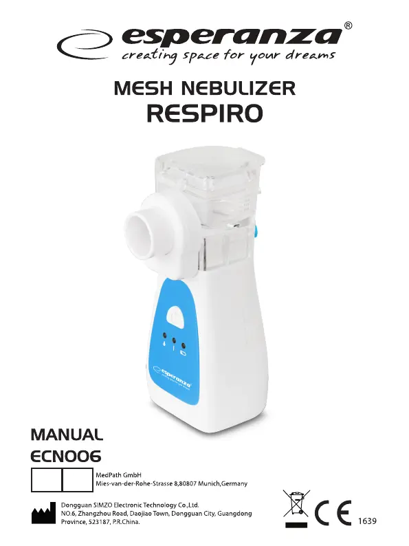 Lies die bedienungsanleitung für Esperanza Respiro ECN006 (36 Seiten) kostenlos online; sie gehört zur Kategorie Inhalator. Dieses Handbuch wurde von 14 Personen als hilfreich bewertet und erhielt im Schnitt 4.6 Sterne aus 7.5 Bewertungen. Hast du eine Frage zu Esperanza Respiro ECN006 oder möchtest du andere Nutzer dieses Produkts befragen? Stelle eine Frage