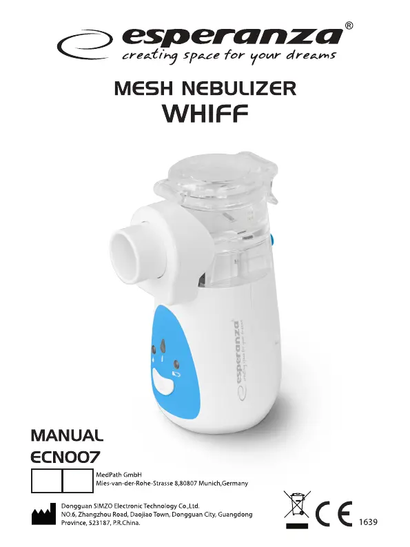 Lies die bedienungsanleitung für Esperanza Whiff ECN007 (36 Seiten) kostenlos online; sie gehört zur Kategorie Inhalator. Dieses Handbuch wurde von 15 Personen als hilfreich bewertet und erhielt im Schnitt 4.5 Sterne aus 8 Bewertungen. Hast du eine Frage zu Esperanza Whiff ECN007 oder möchtest du andere Nutzer dieses Produkts befragen? Stelle eine Frage