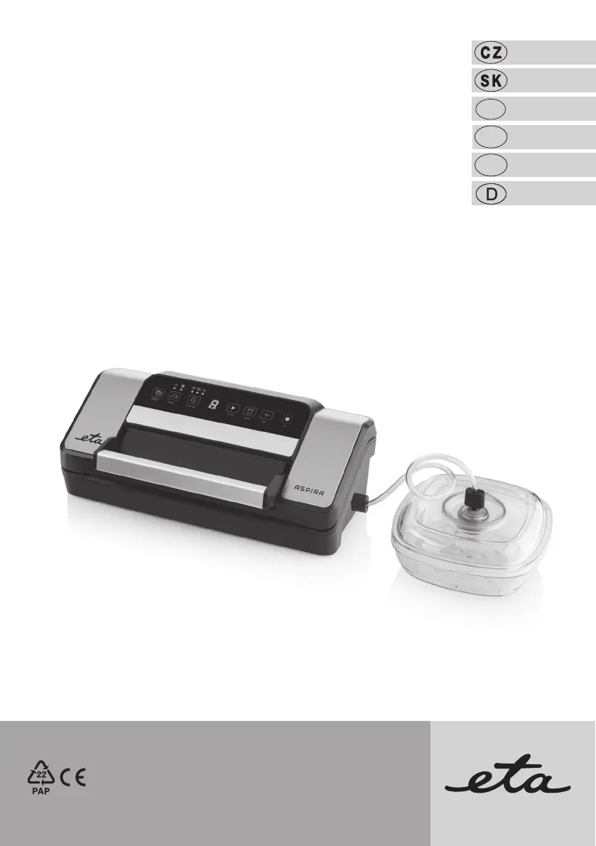 Lies die bedienungsanleitung für Eta Aspira 7762 90000 (52 Seiten) kostenlos online; sie gehört zur Kategorie Vakuumfüller. Dieses Handbuch wurde von 21 Personen als hilfreich bewertet und erhielt im Schnitt 4.5 Sterne aus 11 Bewertungen. Hast du eine Frage zu Eta Aspira 7762 90000 oder möchtest du andere Nutzer dieses Produkts befragen? Stelle eine Frage