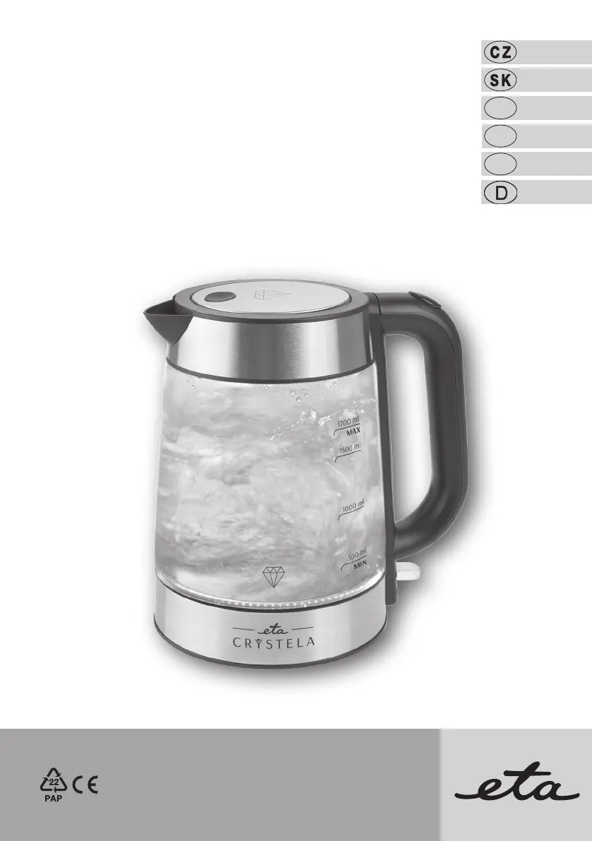 Lies die bedienungsanleitung für Eta Crystela 6153 90000 (40 Seiten) kostenlos online; sie gehört zur Kategorie Wasserkocher. Dieses Handbuch wurde von 15 Personen als hilfreich bewertet und erhielt im Schnitt 3.7 Sterne aus 8 Bewertungen. Hast du eine Frage zu Eta Crystela 6153 90000 oder möchtest du andere Nutzer dieses Produkts befragen? Stelle eine Frage