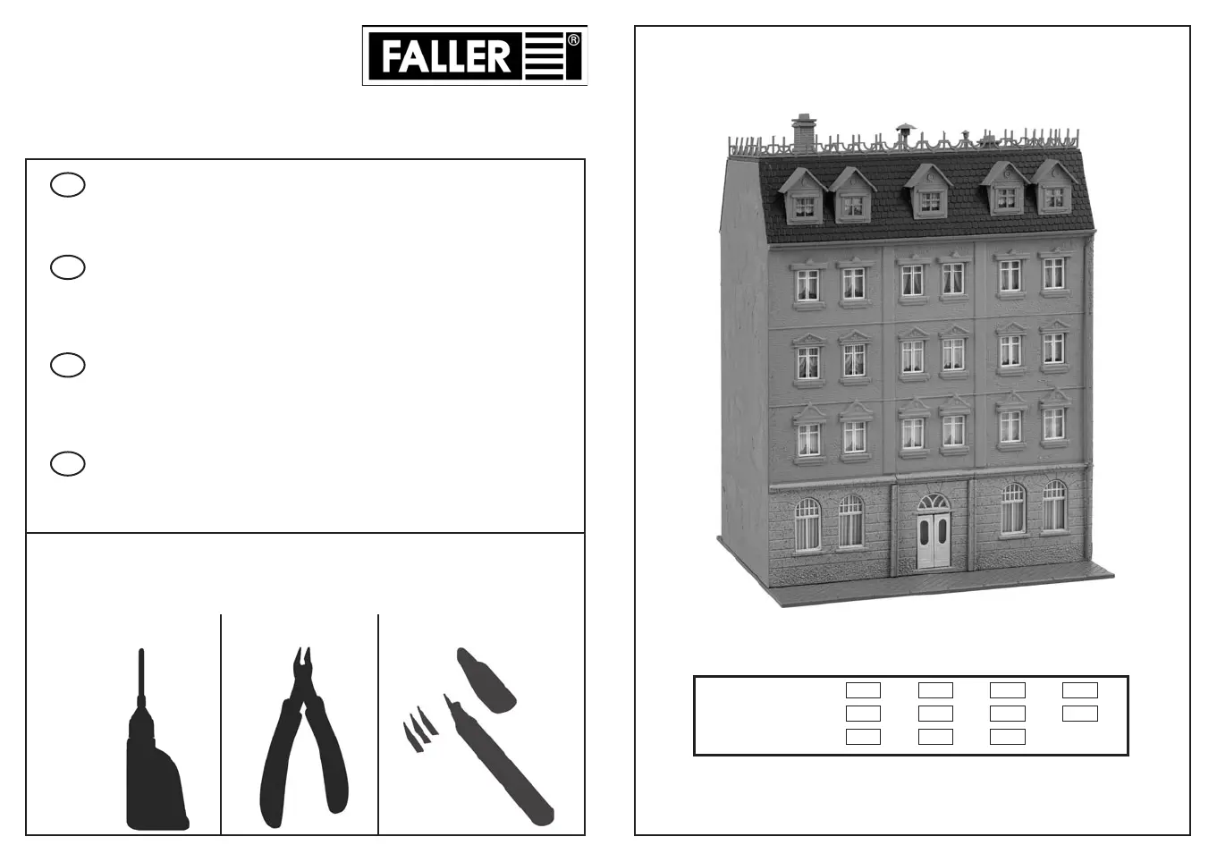 Pour l’assemblage du modèle, nous vous recommandons les articles FALLER suivants (non inclus dans le kit):
