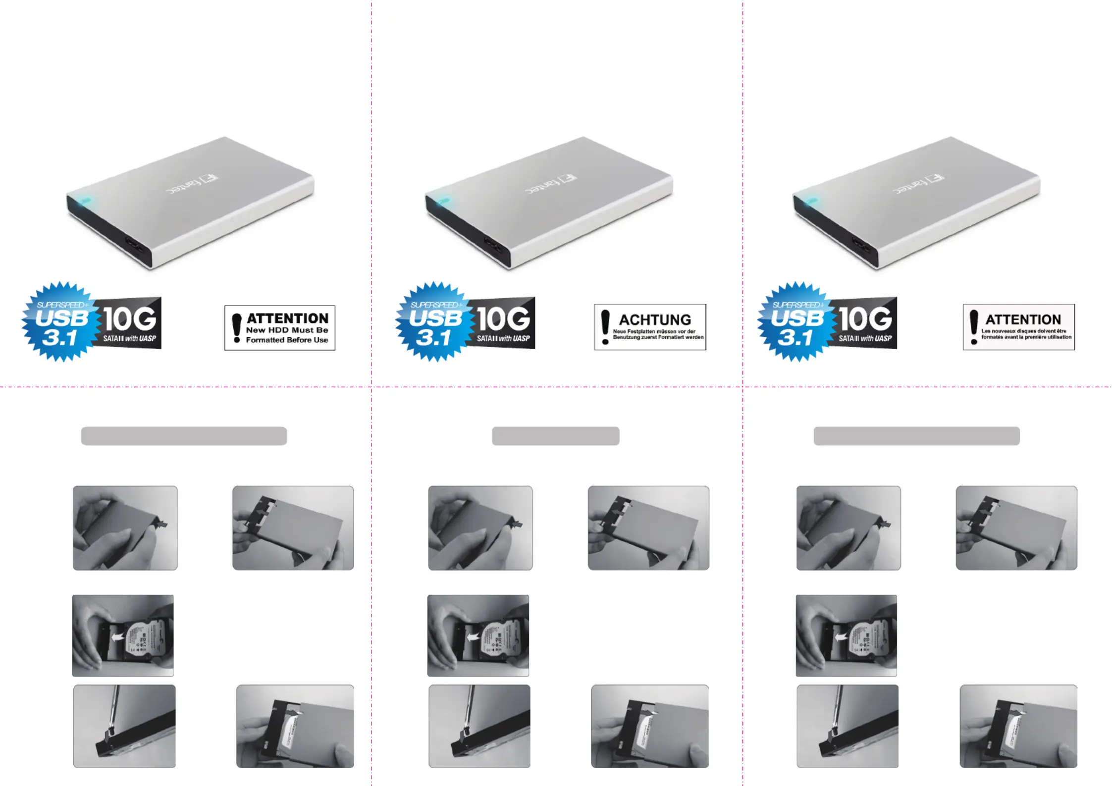 Lies die bedienungsanleitung für Fantec ALU-25B31 (2 Seiten) kostenlos online; sie gehört zur Kategorie Externe Festplatte. Dieses Handbuch wurde von 30 Personen als hilfreich bewertet und erhielt im Schnitt 4.5 Sterne aus 15.5 Bewertungen. Hast du eine Frage zu Fantec ALU-25B31 oder möchtest du andere Nutzer dieses Produkts befragen? Stelle eine Frage