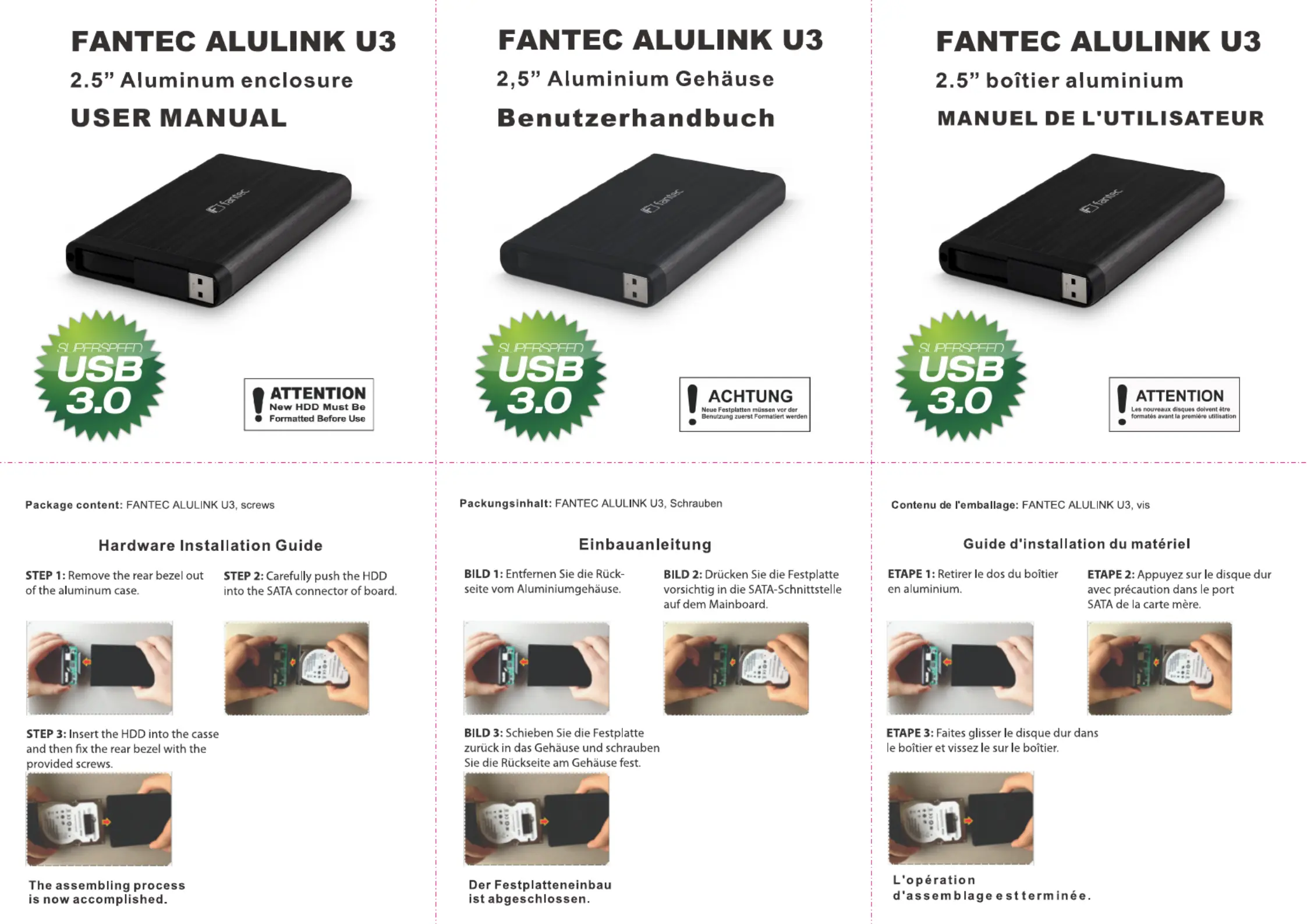 Lies die bedienungsanleitung für Fantec AluLink U3 (2 Seiten) kostenlos online; sie gehört zur Kategorie Festplatte. Dieses Handbuch wurde von 47 Personen als hilfreich bewertet und erhielt im Schnitt 4.3 Sterne aus 24 Bewertungen. Hast du eine Frage zu Fantec AluLink U3 oder möchtest du andere Nutzer dieses Produkts befragen? Stelle eine Frage