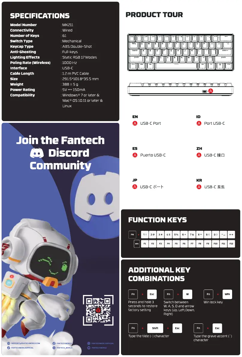 Lies die bedienungsanleitung für Fantech ATOM61 MK211 (2 Seiten) kostenlos online; sie gehört zur Kategorie Klaviatur. Dieses Handbuch wurde von 18 Personen als hilfreich bewertet und erhielt im Schnitt 4.5 Sterne aus 9.5 Bewertungen. Hast du eine Frage zu Fantech ATOM61 MK211 oder möchtest du andere Nutzer dieses Produkts befragen? Stelle eine Frage