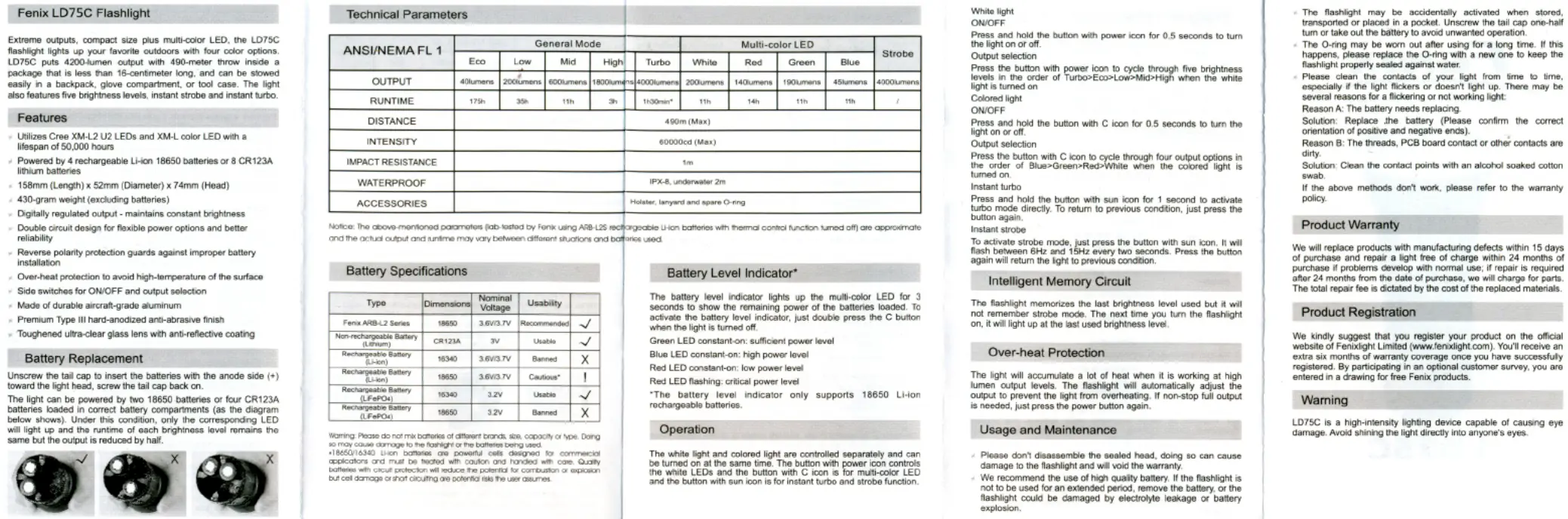 Lies die bedienungsanleitung für Fenix LD75C (1 Seiten) kostenlos online; sie gehört zur Kategorie Taschenlampe. Dieses Handbuch wurde von 17 Personen als hilfreich bewertet und erhielt im Schnitt 4.7 Sterne aus 9 Bewertungen. Hast du eine Frage zu Fenix LD75C oder möchtest du andere Nutzer dieses Produkts befragen? Stelle eine Frage