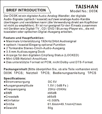 Lies die bedienungsanleitung für FiiO D03K (4 Seiten) kostenlos online; sie gehört zur Kategorie Nicht kategorisiert. Dieses Handbuch wurde von 26 Personen als hilfreich bewertet und erhielt im Schnitt 4.8 Sterne aus 2 Bewertungen. Hast du eine Frage zu FiiO D03K oder möchtest du andere Nutzer dieses Produkts befragen? Stelle eine Frage