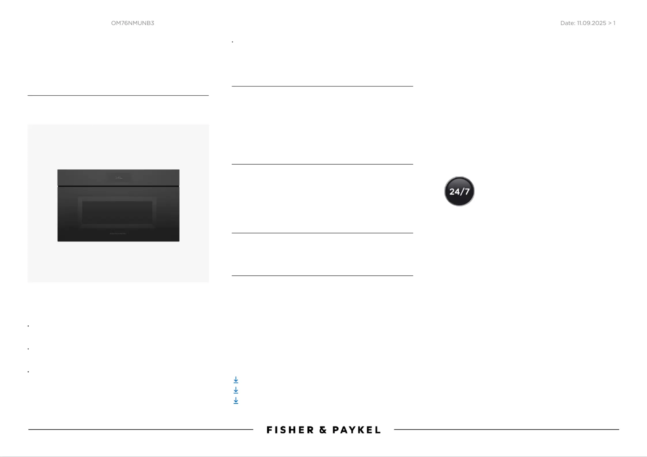 Lies die bedienungsanleitung für Fisher & Paykel OM76NMUNB3 (1 Seiten) kostenlos online; sie gehört zur Kategorie Backöfen. Dieses Handbuch wurde von 23 Personen als hilfreich bewertet und erhielt im Schnitt 4.7 Sterne aus 12 Bewertungen. Hast du eine Frage zu Fisher & Paykel OM76NMUNB3 oder möchtest du andere Nutzer dieses Produkts befragen? Stelle eine Frage
