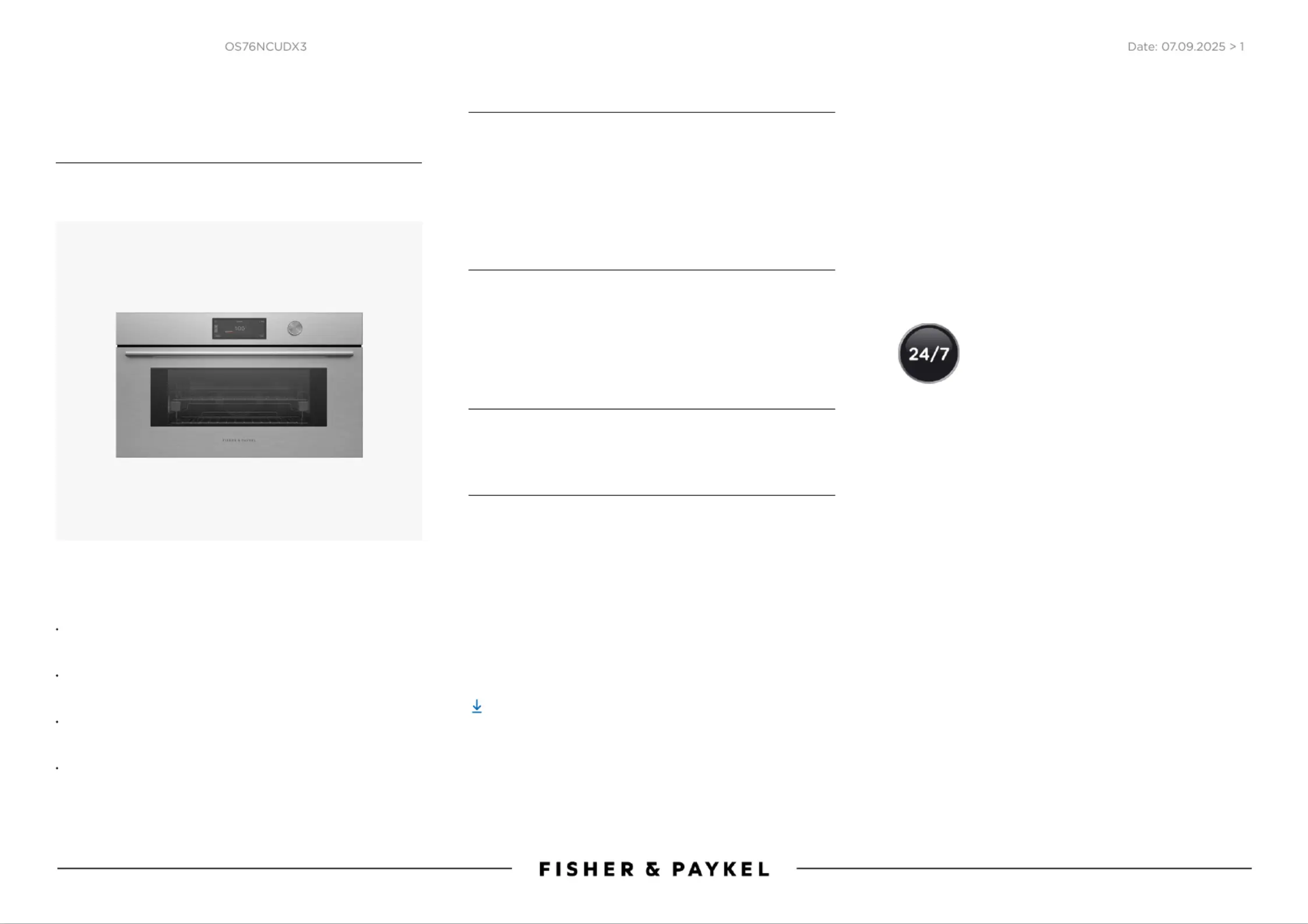 Lies die bedienungsanleitung für Fisher & Paykel OS76NCUDX3 (1 Seiten) kostenlos online; sie gehört zur Kategorie Backöfen. Dieses Handbuch wurde von 3 Personen als hilfreich bewertet und erhielt im Schnitt 4.5 Sterne aus 2 Bewertungen. Hast du eine Frage zu Fisher & Paykel OS76NCUDX3 oder möchtest du andere Nutzer dieses Produkts befragen? Stelle eine Frage