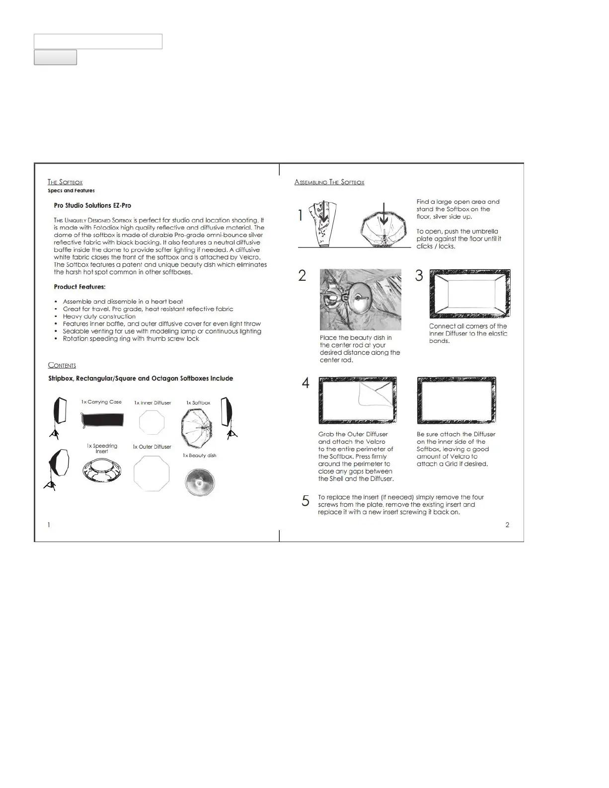 Lies die bedienungsanleitung für Fotodiox EZ-Pro Deep Parabolic Softbox (2 Seiten) kostenlos online; sie gehört zur Kategorie Nicht kategorisiert. Dieses Handbuch wurde von 9 Personen als hilfreich bewertet und erhielt im Schnitt 3.9 Sterne aus 5 Bewertungen. Hast du eine Frage zu Fotodiox EZ-Pro Deep Parabolic Softbox oder möchtest du andere Nutzer dieses Produkts befragen? Stelle eine Frage