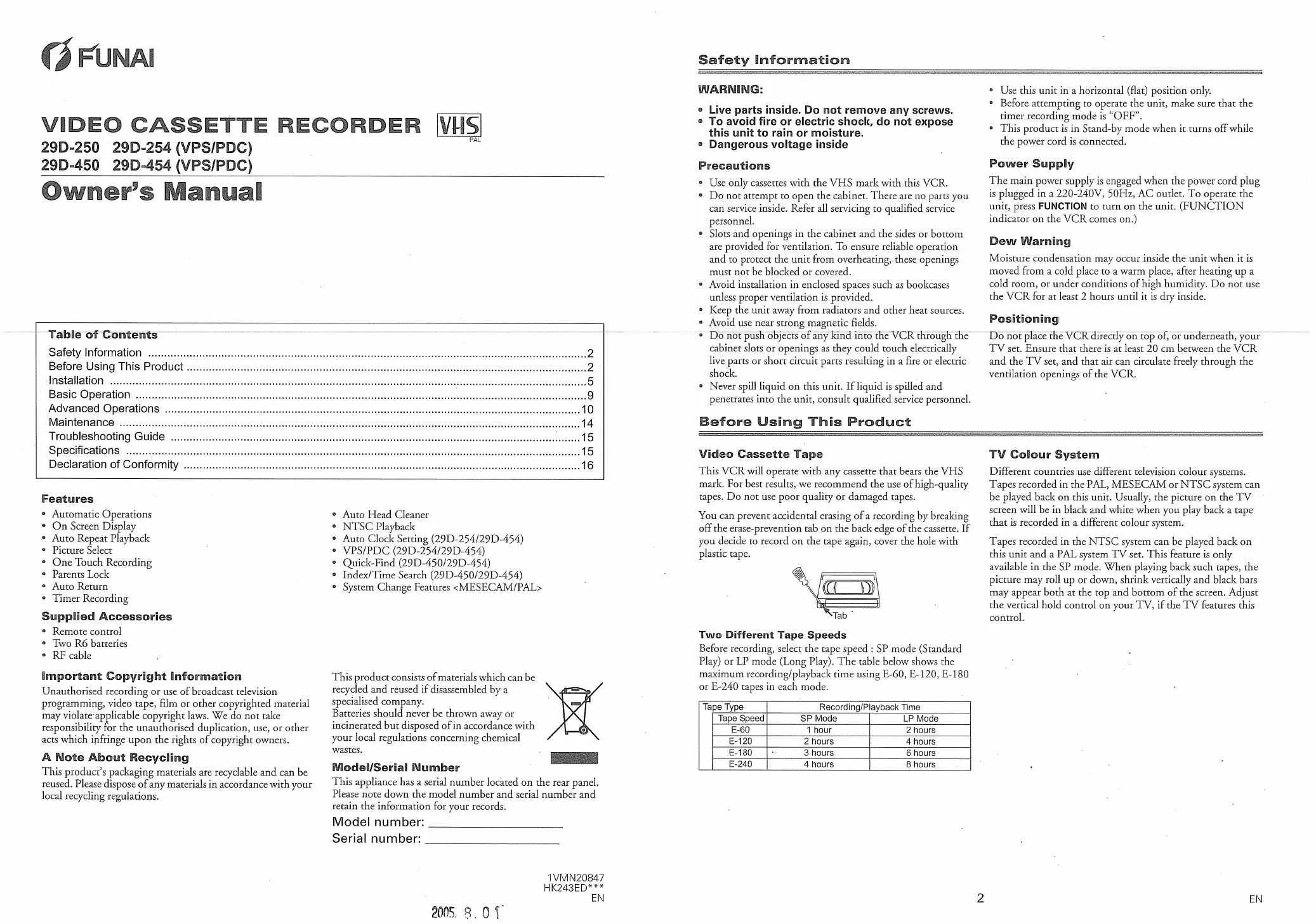 Lies die bedienungsanleitung für Funai 29D450 (8 Seiten) kostenlos online; sie gehört zur Kategorie Videokassettenrecorder. Dieses Handbuch wurde von 4 Personen als hilfreich bewertet und erhielt im Schnitt 4.9 Sterne aus 2.5 Bewertungen. Hast du eine Frage zu Funai 29D450 oder möchtest du andere Nutzer dieses Produkts befragen? Stelle eine Frage