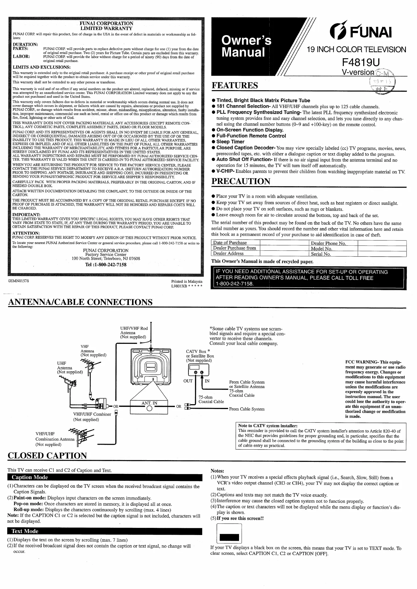 Lies die bedienungsanleitung für Funai F4819UV (8 Seiten) kostenlos online; sie gehört zur Kategorie Fernsehen. Dieses Handbuch wurde von 45 Personen als hilfreich bewertet und erhielt im Schnitt 4.6 Sterne aus 6 Bewertungen. Hast du eine Frage zu Funai F4819UV oder möchtest du andere Nutzer dieses Produkts befragen? Stelle eine Frage