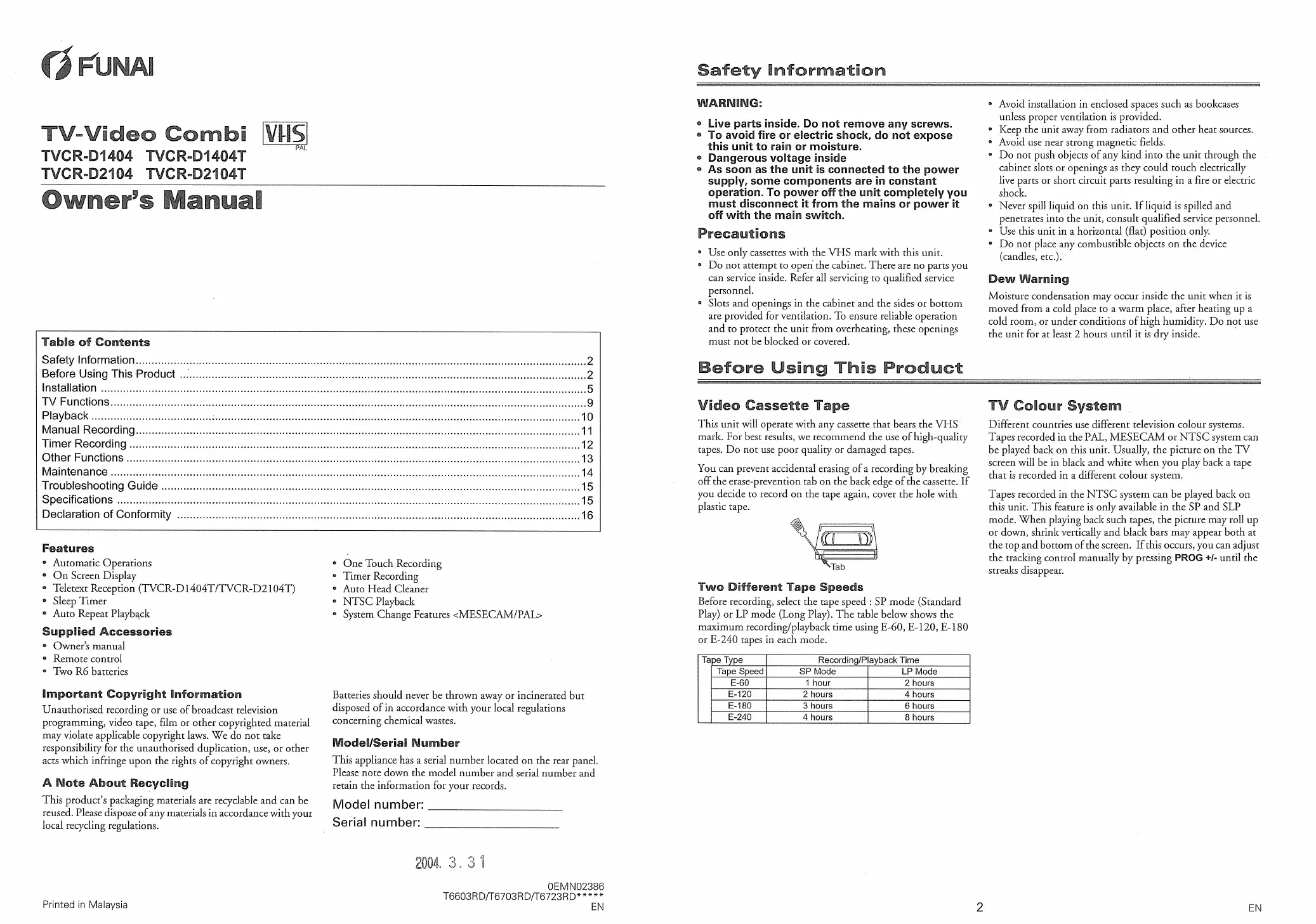 Funai TVCR-D2104 Bedienungsanleitung