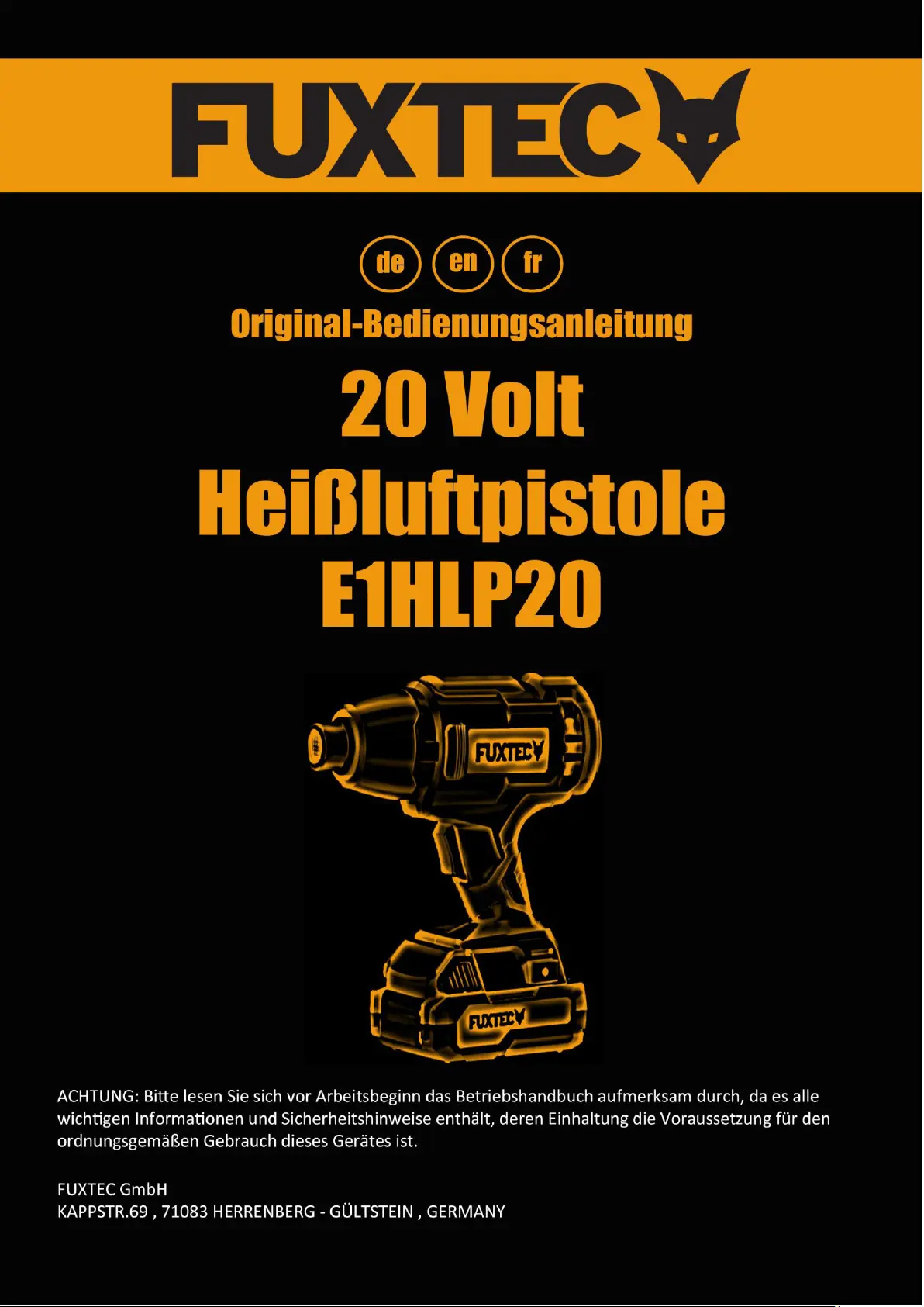 Lies die bedienungsanleitung für Fuxtec FX-E1HLP20 (34 Seiten) kostenlos online; sie gehört zur Kategorie Heißluftpistole. Dieses Handbuch wurde von 26 Personen als hilfreich bewertet und erhielt im Schnitt 4.5 Sterne aus 5 Bewertungen. Hast du eine Frage zu Fuxtec FX-E1HLP20 oder möchtest du andere Nutzer dieses Produkts befragen? Stelle eine Frage