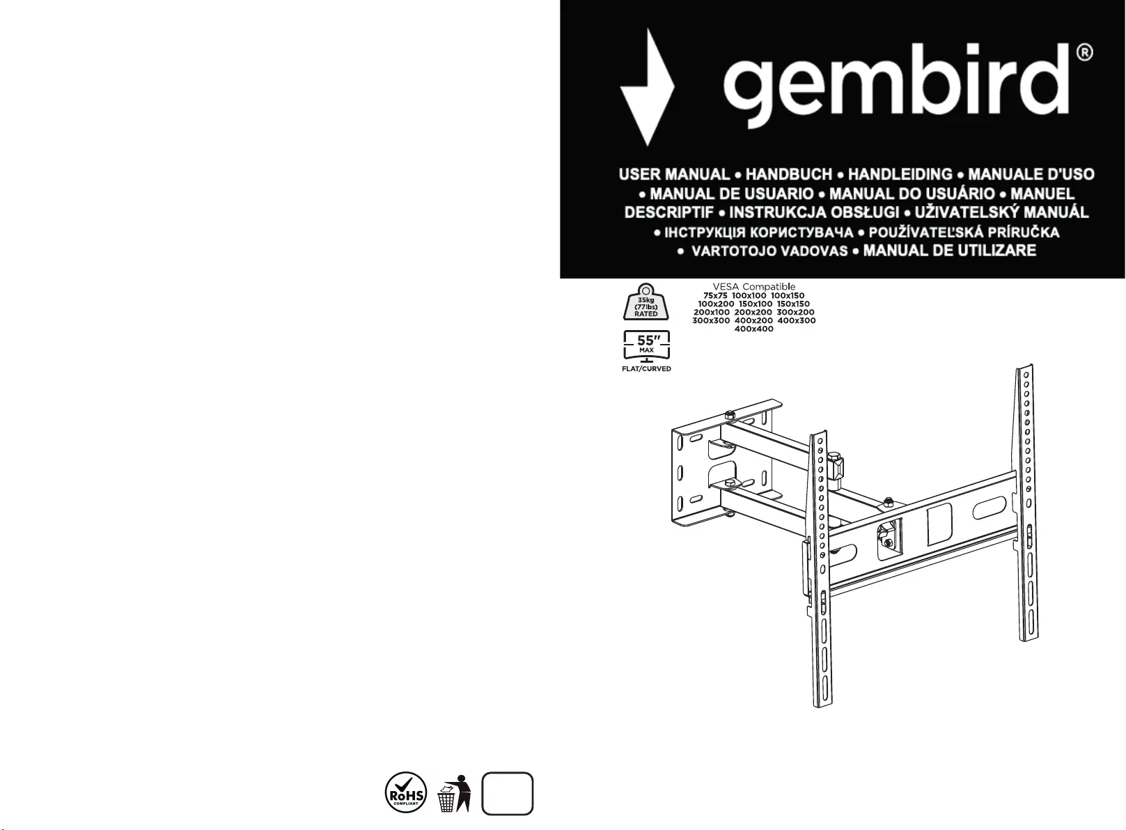 Lies die bedienungsanleitung für Gembird WM-55ST-03 (2 Seiten) kostenlos online; sie gehört zur Kategorie Wandstütze. Dieses Handbuch wurde von 5 Personen als hilfreich bewertet und erhielt im Schnitt 4.3 Sterne aus 3 Bewertungen. Hast du eine Frage zu Gembird WM-55ST-03 oder möchtest du andere Nutzer dieses Produkts befragen? Stelle eine Frage