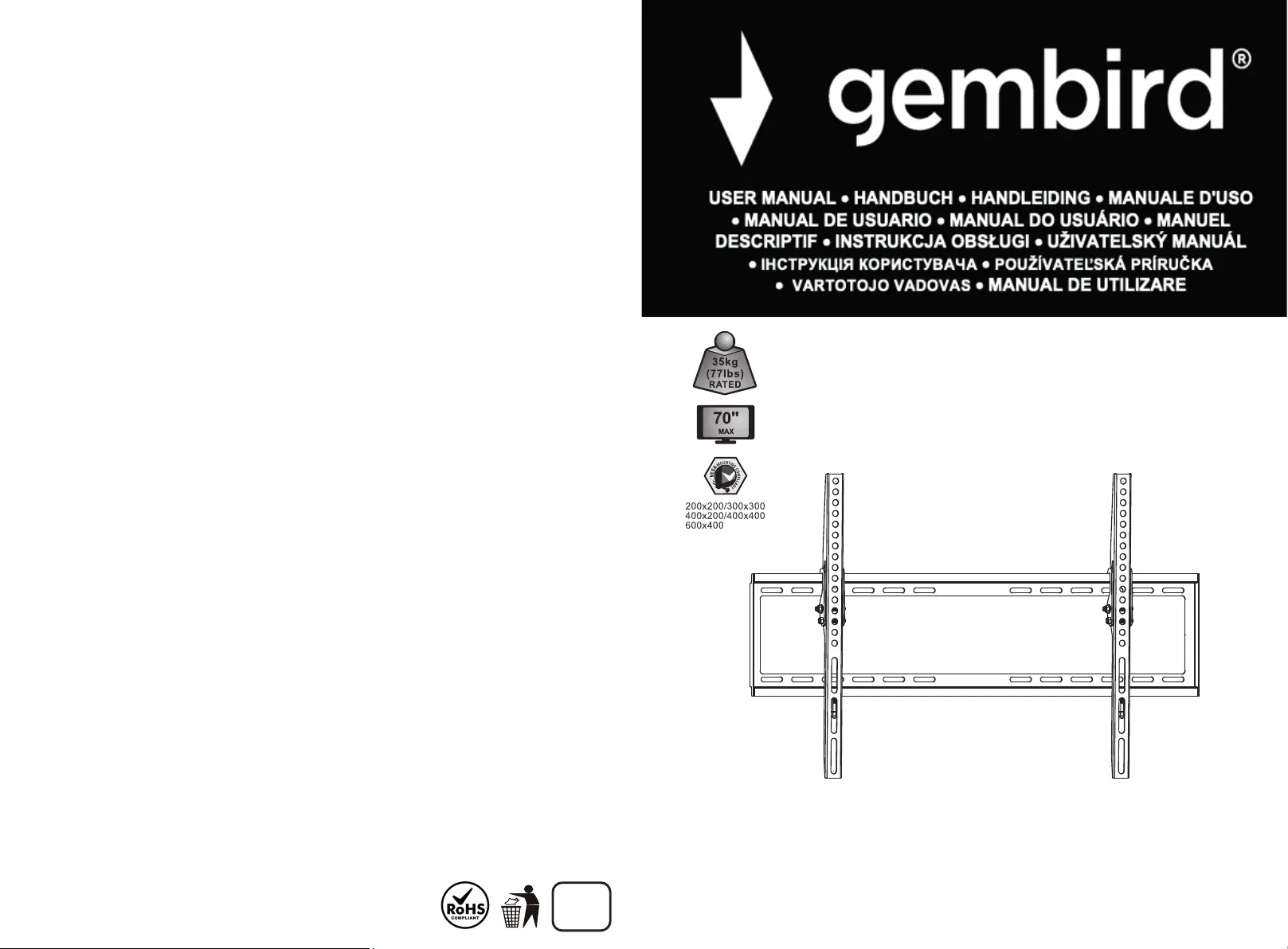 Lies die bedienungsanleitung für Gembird WM-70T-03 (2 Seiten) kostenlos online; sie gehört zur Kategorie Wandstütze. Dieses Handbuch wurde von 5 Personen als hilfreich bewertet und erhielt im Schnitt 4.6 Sterne aus 3 Bewertungen. Hast du eine Frage zu Gembird WM-70T-03 oder möchtest du andere Nutzer dieses Produkts befragen? Stelle eine Frage