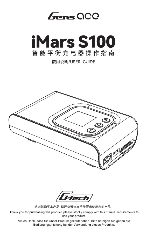 Lies die bedienungsanleitung für Gens ace iMars S100 (24 Seiten) kostenlos online; sie gehört zur Kategorie Ladegerät. Dieses Handbuch wurde von 3 Personen als hilfreich bewertet und erhielt im Schnitt 4.9 Sterne aus 2 Bewertungen. Hast du eine Frage zu Gens ace iMars S100 oder möchtest du andere Nutzer dieses Produkts befragen? Stelle eine Frage