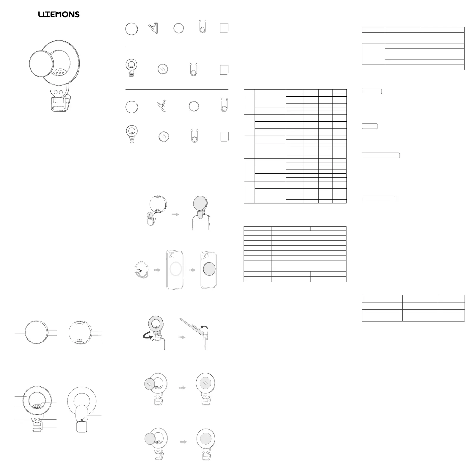 1.将夹子固定于手机,可360°旋转及垂直90°调节补光方向。