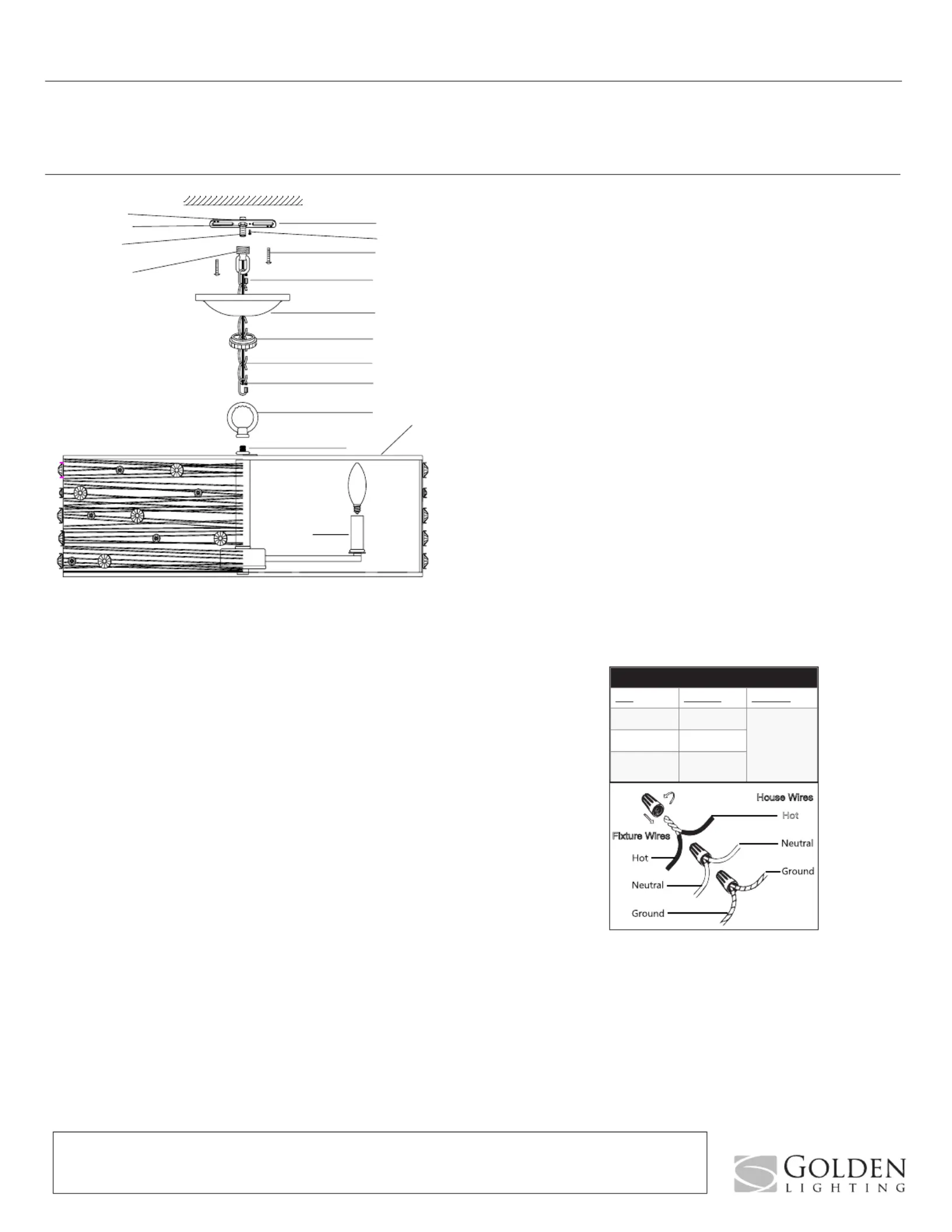collar (I) and canopy (G) onto the chain and wires. Use the free chain connector (K) to attach chain (J) to canopy loop (H).