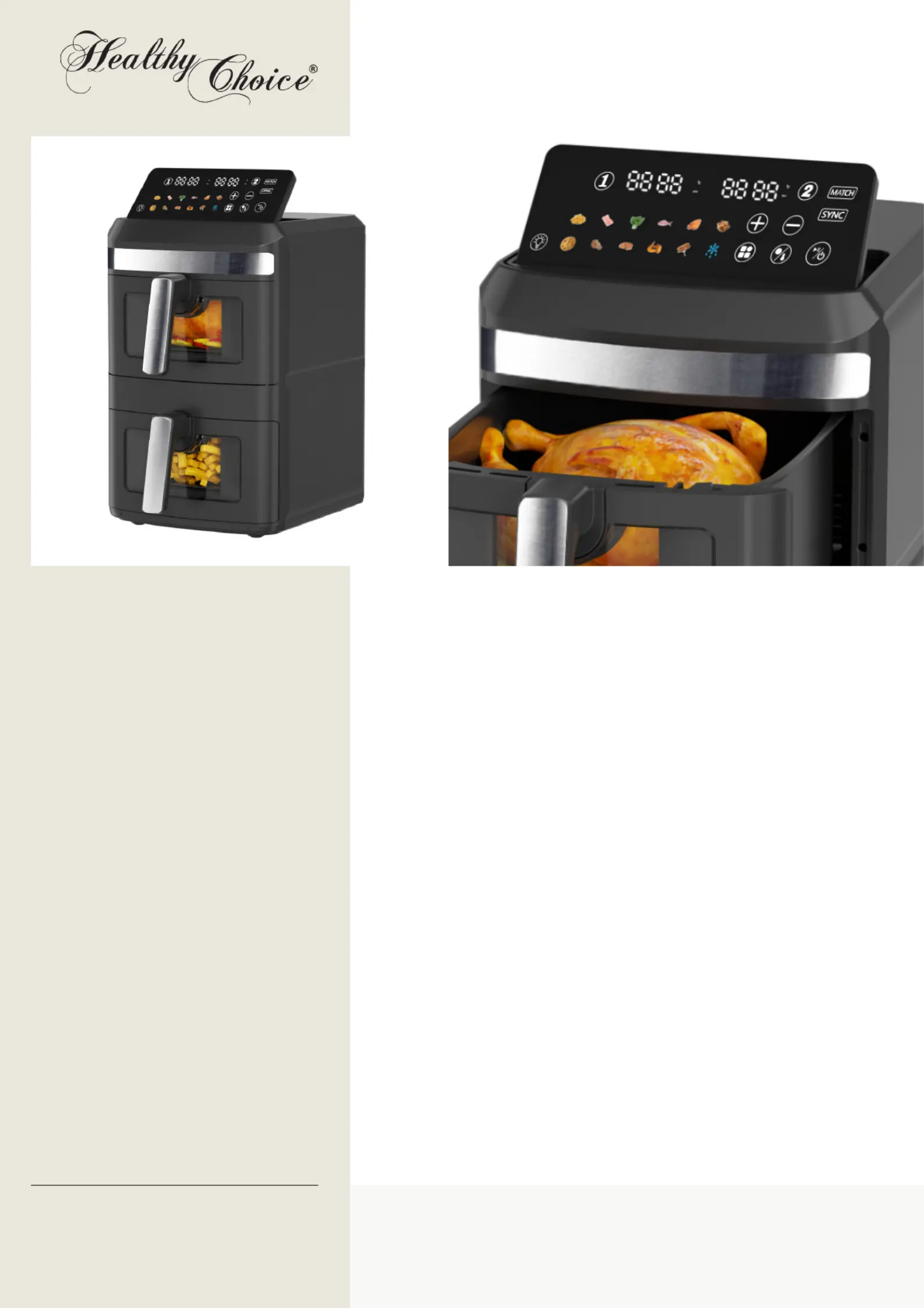 • Dual-Zone Cooking: Upper and lower baskets can operate