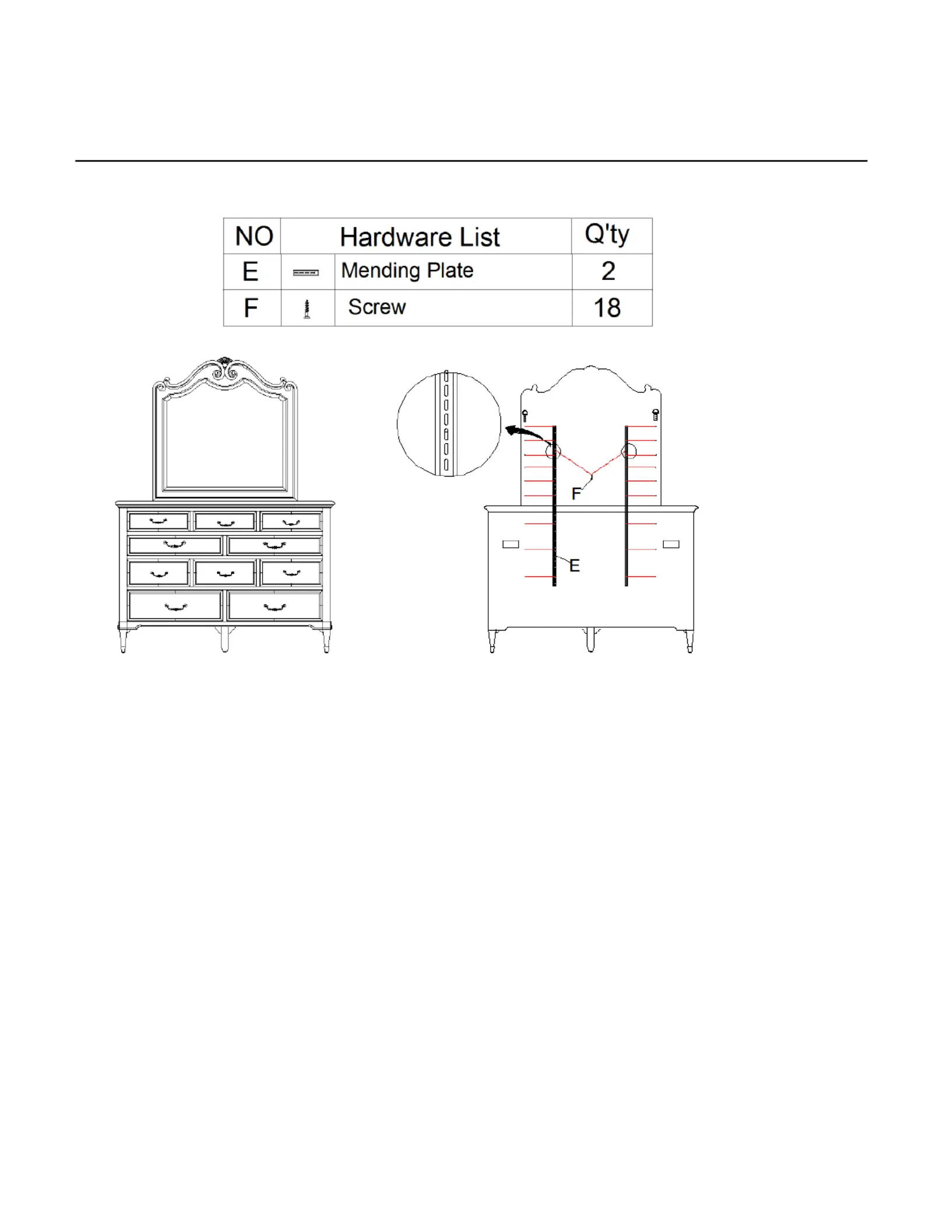 2. Attach a mending plate (E) at back of mirror and back of dresser. Align holes on mending p late