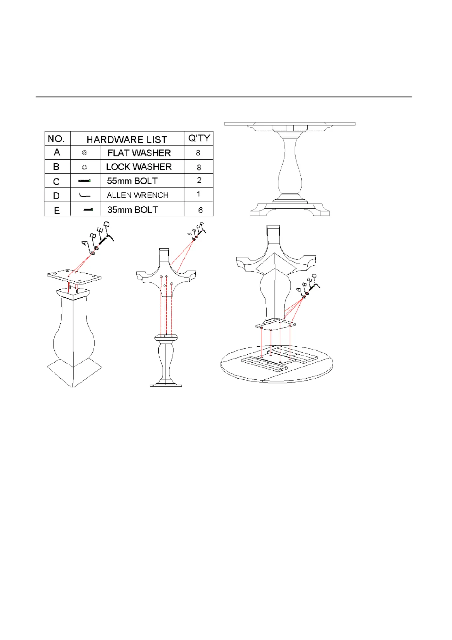 assembledbasetotopusing4bolts(E),4lockwashers(B),4atwashers(A),byturningwith