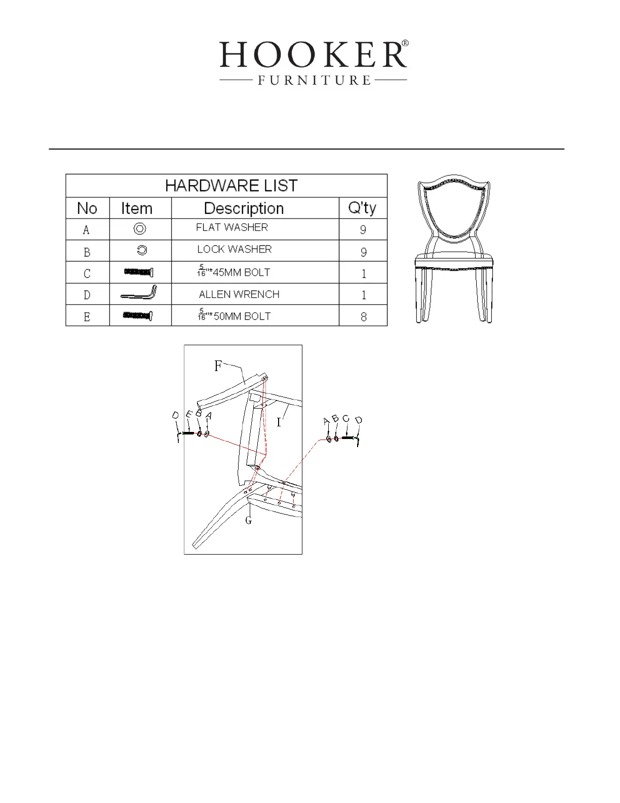 center location. (see diagram 1) Then tighten seat frame (I) to chair back (G) by using bolts (E),
