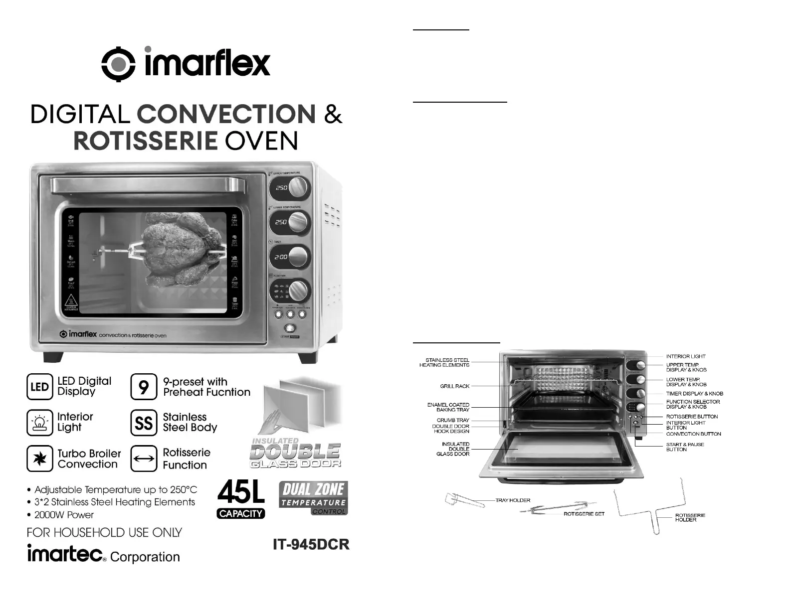 Lies die bedienungsanleitung für Imarflex IT-945DCR (4 Seiten) kostenlos online; sie gehört zur Kategorie Backöfen. Dieses Handbuch wurde von 2 Personen als hilfreich bewertet und erhielt im Schnitt 4.6 Sterne aus 9 Bewertungen. Hast du eine Frage zu Imarflex IT-945DCR oder möchtest du andere Nutzer dieses Produkts befragen? Stelle eine Frage
