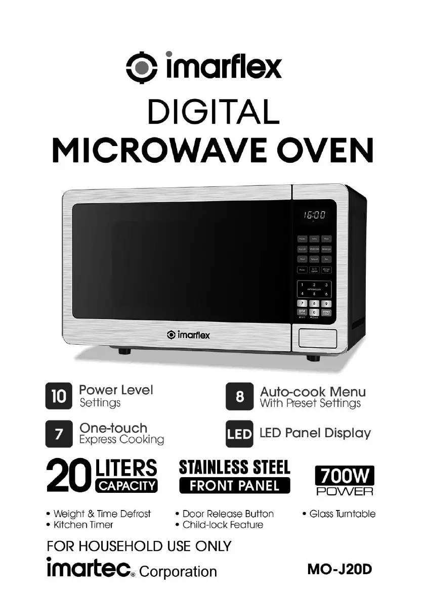 Lies die bedienungsanleitung für Imarflex MO-J20D (16 Seiten) kostenlos online; sie gehört zur Kategorie Mikrowelle. Dieses Handbuch wurde von 2 Personen als hilfreich bewertet und erhielt im Schnitt 4.8 Sterne aus 4 Bewertungen. Hast du eine Frage zu Imarflex MO-J20D oder möchtest du andere Nutzer dieses Produkts befragen? Stelle eine Frage
