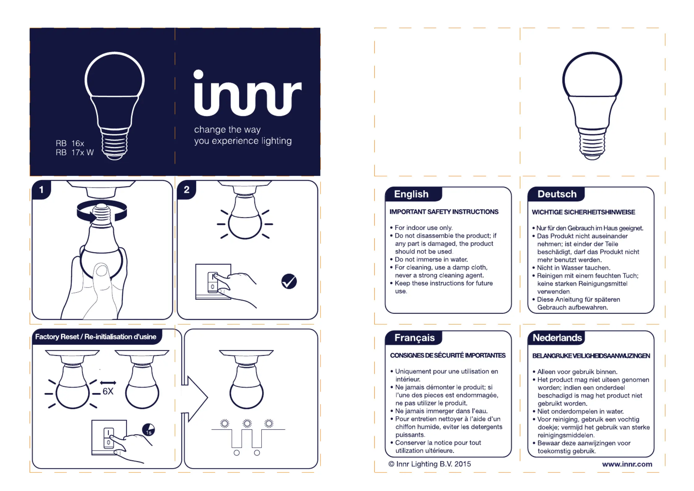 Lies die bedienungsanleitung für Innr Bulb (1 Seiten) kostenlos online; sie gehört zur Kategorie Erleichterung. Dieses Handbuch wurde von 27 Personen als hilfreich bewertet und erhielt im Schnitt 4.6 Sterne aus 14 Bewertungen. Hast du eine Frage zu Innr Bulb oder möchtest du andere Nutzer dieses Produkts befragen? Stelle eine Frage