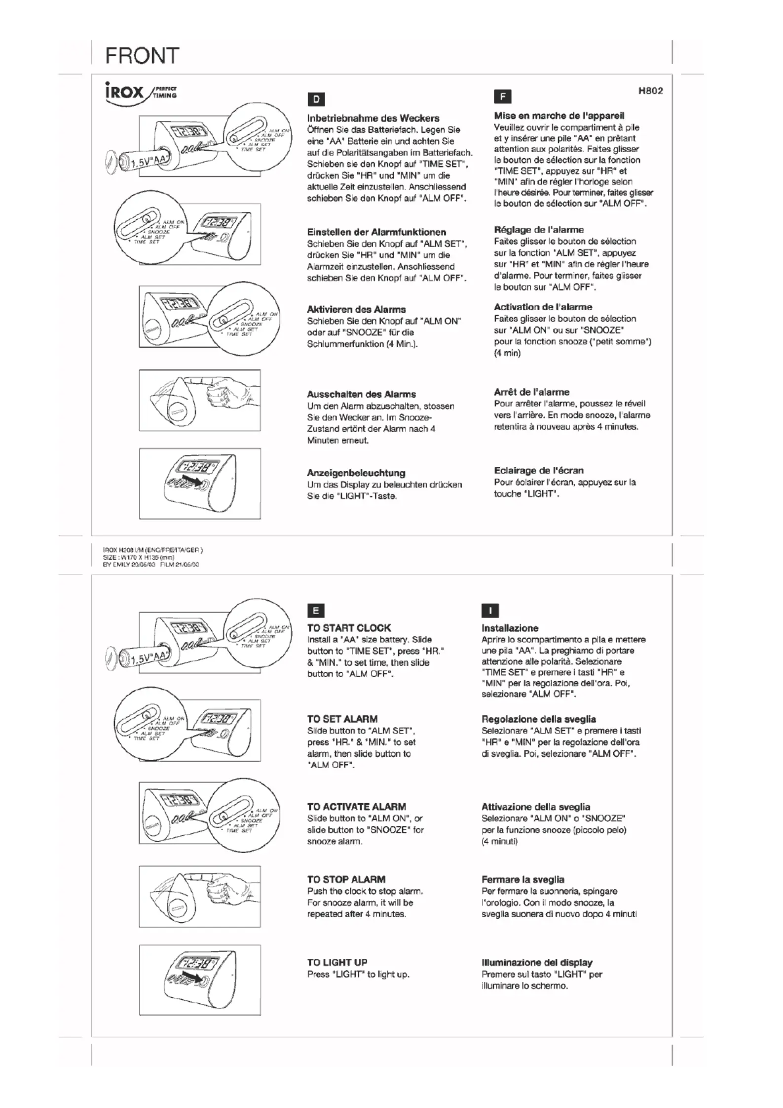 Lies die bedienungsanleitung für Irox H802 (1 Seiten) kostenlos online; sie gehört zur Kategorie Wecker. Dieses Handbuch wurde von 35 Personen als hilfreich bewertet und erhielt im Schnitt 3.8 Sterne aus 18 Bewertungen. Hast du eine Frage zu Irox H802 oder möchtest du andere Nutzer dieses Produkts befragen? Stelle eine Frage