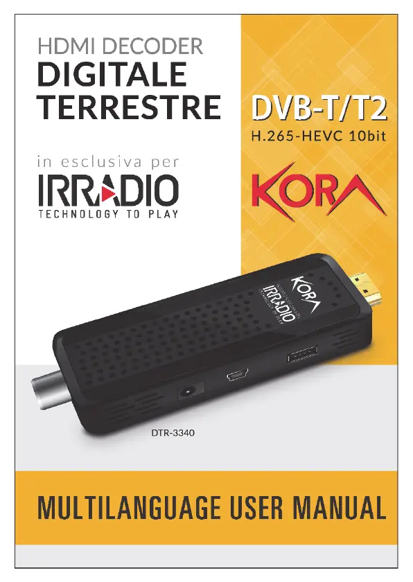 Lies die bedienungsanleitung für Kora DVB-T2 (37 Seiten) kostenlos online; sie gehört zur Kategorie Nicht kategorisiert. Dieses Handbuch wurde von 2 Personen als hilfreich bewertet und erhielt im Schnitt 3.6 Sterne aus 1.5 Bewertungen. Hast du eine Frage zu Kora DVB-T2 oder möchtest du andere Nutzer dieses Produkts befragen? Stelle eine Frage