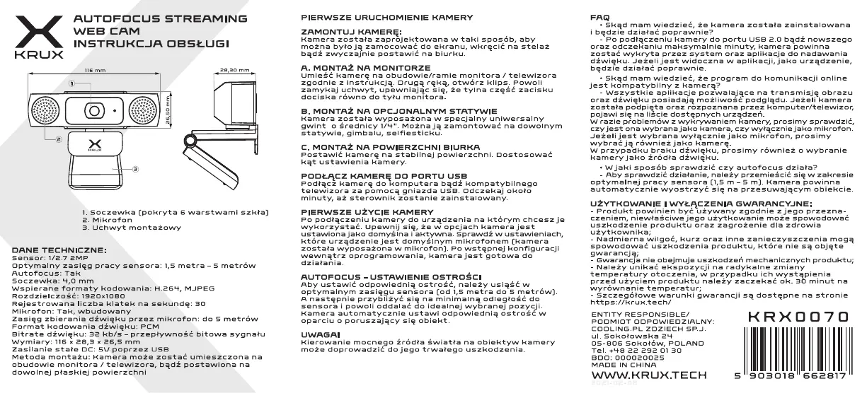 Lies die bedienungsanleitung für KRUX KRX0070 (2 Seiten) kostenlos online; sie gehört zur Kategorie Webcam. Dieses Handbuch wurde von 13 Personen als hilfreich bewertet und erhielt im Schnitt 5.0 Sterne aus 7 Bewertungen. Hast du eine Frage zu KRUX KRX0070 oder möchtest du andere Nutzer dieses Produkts befragen? Stelle eine Frage