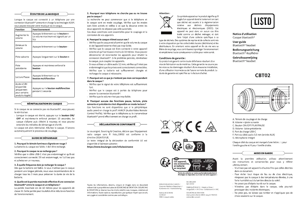 Lies die bedienungsanleitung für Listo CBT02 (8 Seiten) kostenlos online; sie gehört zur Kategorie Kopfhörer. Dieses Handbuch wurde von 14 Personen als hilfreich bewertet und erhielt im Schnitt 4.6 Sterne aus 7.5 Bewertungen. Hast du eine Frage zu Listo CBT02 oder möchtest du andere Nutzer dieses Produkts befragen? Stelle eine Frage